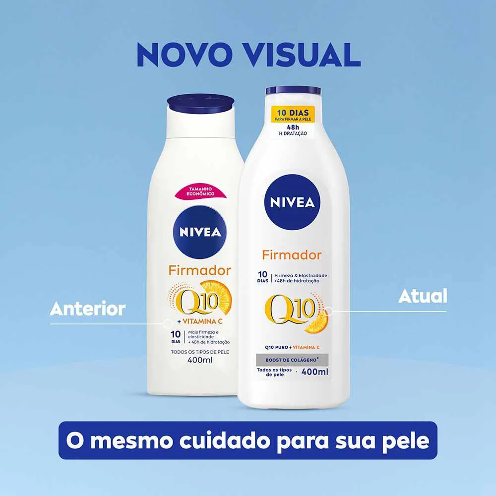 O que é? NIVEA Loção Hidratante Firmador Q10 + vitamina c Todos os tipos de pele é uma loção hidratante que conta com a poderosa combinação de Q10 e vitamina C em sua fórmula, dois antioxidantes que melhoram visivelmente a firmeza da pele.
