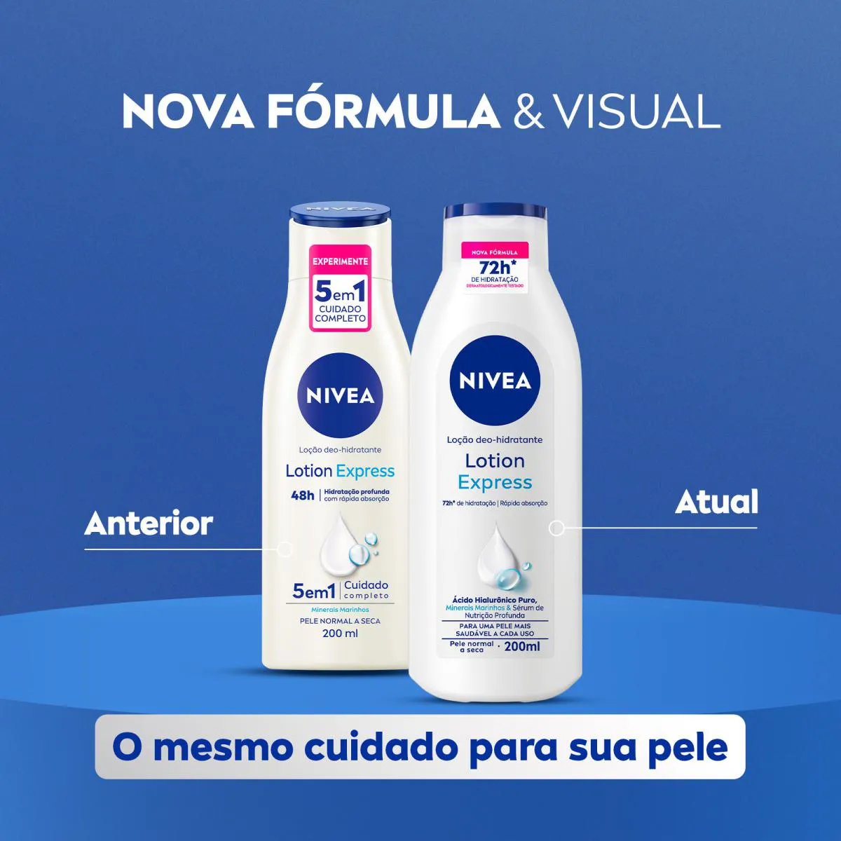 O que é? NIVEA Loção Hidratante Lotion Express é um produto desenvolvido com textura ultraleve e de absorção imediata.