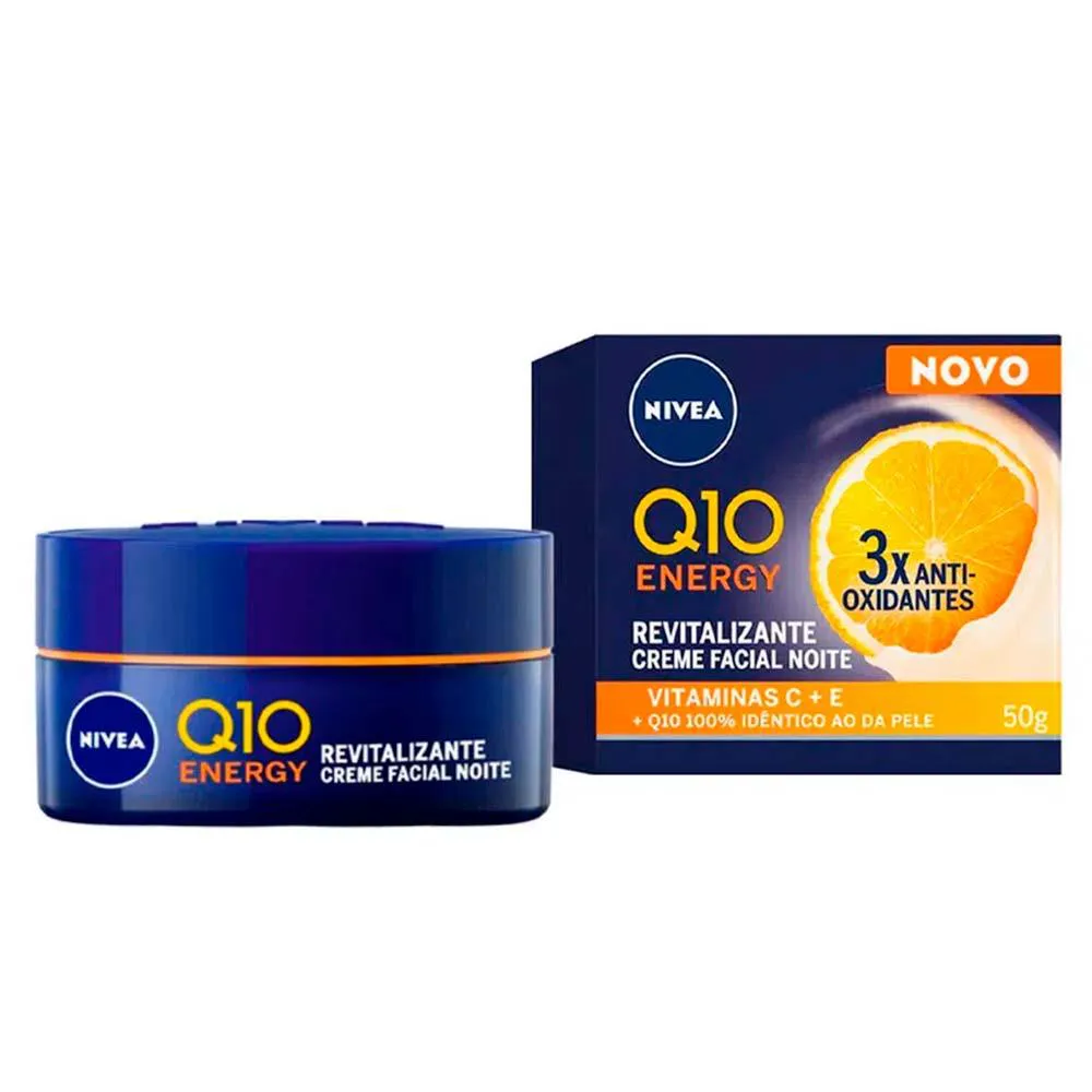 Creme Facial Antissinais Q10 Energy NoturnoNIVEA Q10 vitamina C Creme Facial Noite revitaliza a pele durante a noite, quando ela está mais receptiva para receber o produto. Sua fórmula com Vitamina C, vitamina e e Q10 auxilia a capacidade da sua pele de melhorar o metabolismo protegendo-a dos radicais livres que prejudicam a pele. Além disso, ajuda a melhorar os principais sinais de stress: linhas de expressão, falta de luminosidade e pele cansada, melhorando a hidratação e fortalecendo a barreira de proteção da pele. Tenha uma pele com aparência mais jovem e firme em 2 semanas com o novo Q10 Vitamina C!