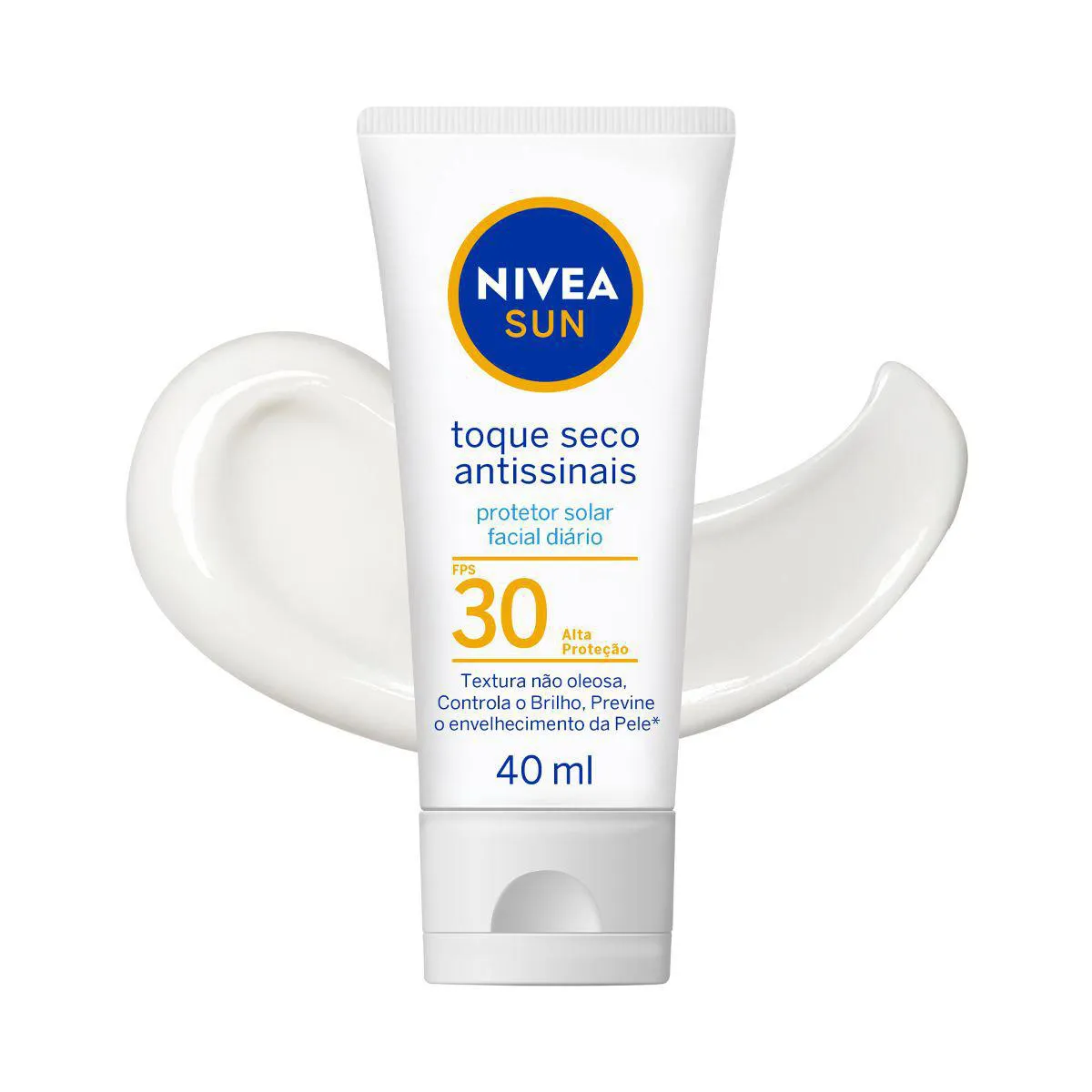 O Protetor Solar Facial Nivea Sun Toque Seco Antissinais é um produto de proteção solar facial de uso diário, com textura leve e de rápida absorção. Serve para proteger a pele do rosto contra os raios UVA e UVB, prevenindo o envelhecimento precoce, controlando o brilho e deixando a pele macia e radiante. Possui FPS 30 e é ideal para ser aplicado antes da maquiagem, sendo adequado para todos os tipos de pele.