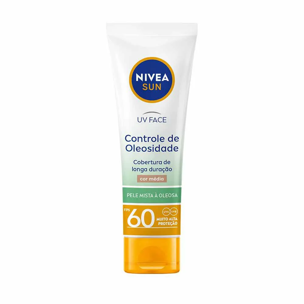 O que é? NIVEA SUN protetor solar UV Face Controle de Oleosidade Cor Média FPS 60 é um protetor solar de muito alta proteção que, além de não obstruir os poros¹, controla a oleosidade da pele.