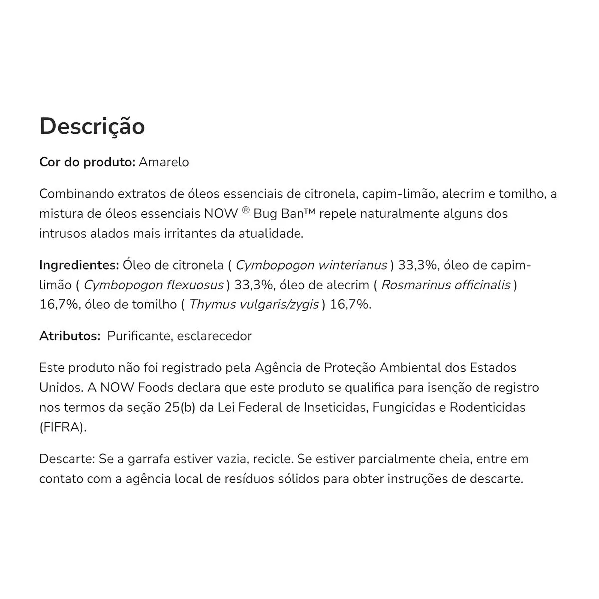 Mistura Óleo Essenciais Bug Ban Now Foods 30ml Importado