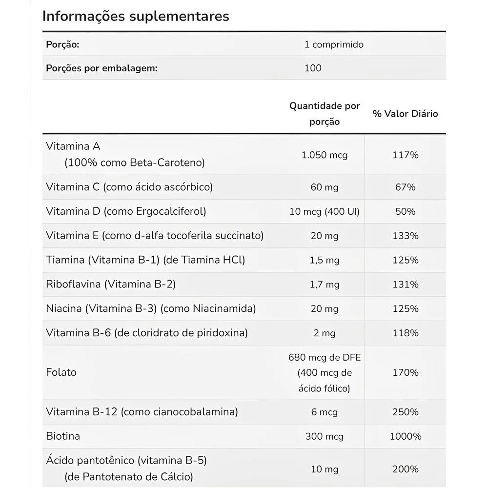 O frasco contém 100 comprimidos, proporcionando uma dose prática e conveniente para o uso diário. Os comprimidos são fáceis de ingerir, facilitando a inclusão do suplemento na rotina diária de cuidados com o organismo. Validade longa.
