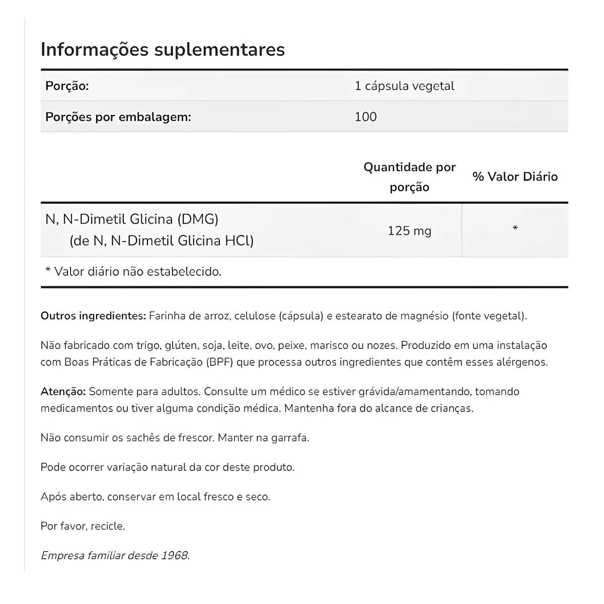 Cada frasco contém 100 cápsulas de DMG Dimetilglicina 125mg, oferecendo uma quantidade ideal para suplementação prolongada. As cápsulas são fáceis de ingerir, e a embalagem prática torna a inclusão desse suplemento na sua rotina diária simples e conveniente. Validade longa.