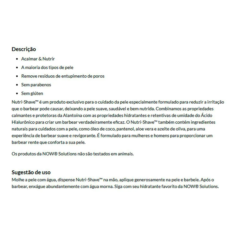 O Creme de Barbear Nutri-Shave Now Foods foi desenvolvido para proporcionar conforto durante o barbear. Ele ajuda a deixar a pele macia e preparada para uma experiência mais agradável.