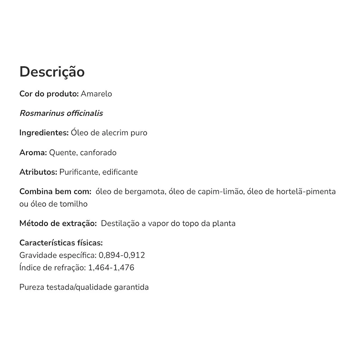 O Óleo de Alecrim é um óleo essencial extraído das folhas da planta Rosmarinus officinalis, amplamente utilizado na aromaterapia. Seu principal objetivo é aumentar o foco, a clareza mental e estimular a energia, além de ajudar a aliviar tensões e promover bem-estar geral.