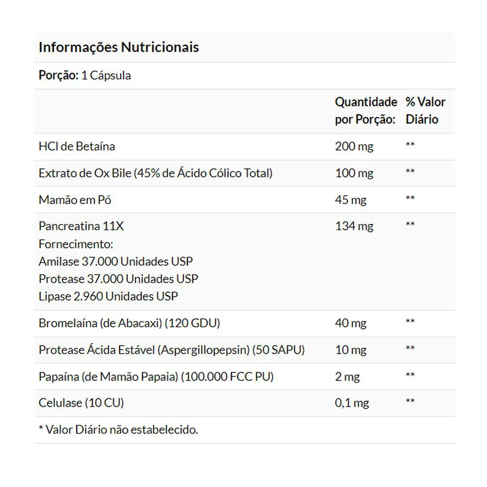 Ação Rápida: O produto foi formulado para agir rapidamente, garantindo eficácia logo após a ingestão. Isso significa que, seja qual for a refeição, você pode contar com um suporte digestivo eficiente para ajudar na quebra dos alimentos.;