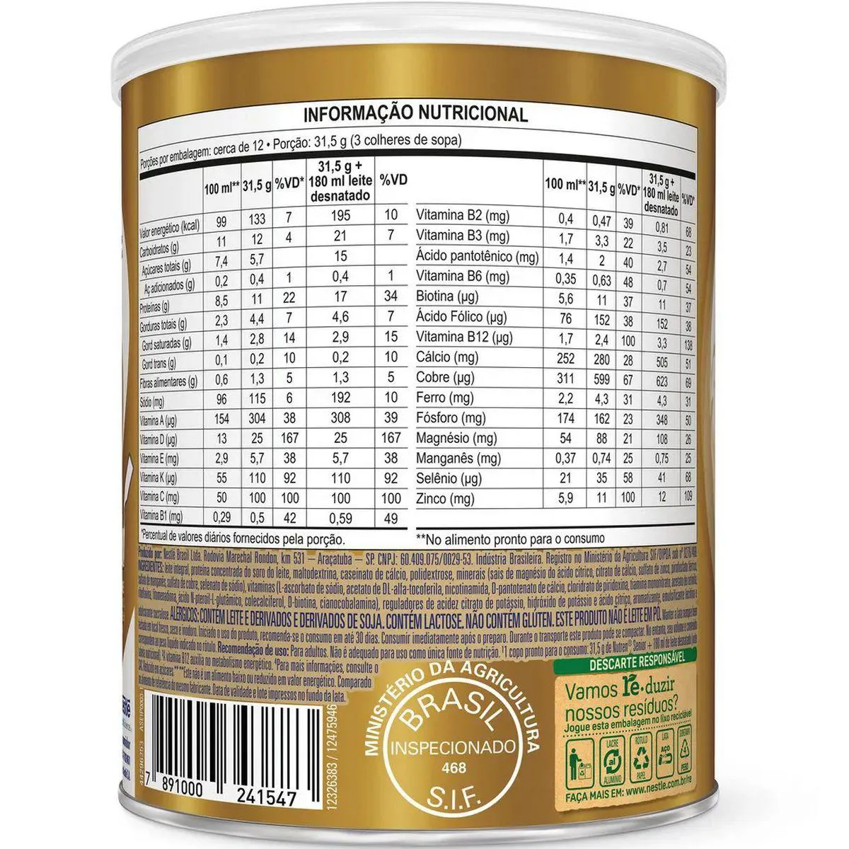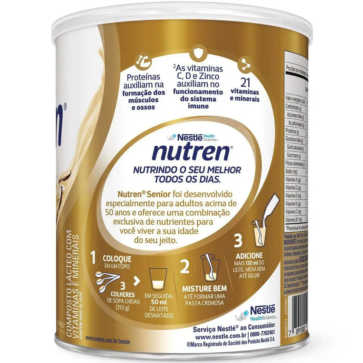 NUTREN SENIOR: A CHAVE PARA VIVER A MATURIDADE COM VITALIDADE E BEM-ESTAR, DO SEU JEITO. Nutren Senior é o complemento alimentar desenvolvido pela Nestlé especialmente para adultos acima de 50 anos. Sua fórmula exclusiva oferece uma combinação precisa de nutrientes essenciais para uma vida ativa e saudável na maturidade. PARA QUEM É INDICADO: Indicado para adultos acima de 50 anos que buscam manter uma rotina saudável e ativa, Nutren Senior é ideal para complementar as necessidades nutricionais nessa fase da vida. BENEFÍCIOS: Vitaminas do complexo B vitamina c, vitamina d e zinco Proteínas e cálcio Contém 21 vitaminas e minerais CUIDADOS E CONSERVAÇÃO: Mantenha a lata sempre bem fechada em local fresco, seco e inodoro. Consuma imediatamente após o preparo. Contém leite e derivados, derivados de soja e lactose. Não contém glúten. Advertências: "ESTE PRODUTO NÃO É UM MEDICAMENTO" "ESTE PRODUTO É UM SUPLEMENTO ALIMENTAR" "MANTENHA FORA DO ALCANCE DE CRIANÇAS" "NÃO EXCEDER A RECOMENDAÇÃO DIÁRIA DE CONSUMO INDICADA NA EMBALAGEM" Registro no M.S. nº Produto dispensado de registro RDC 240 de 2018