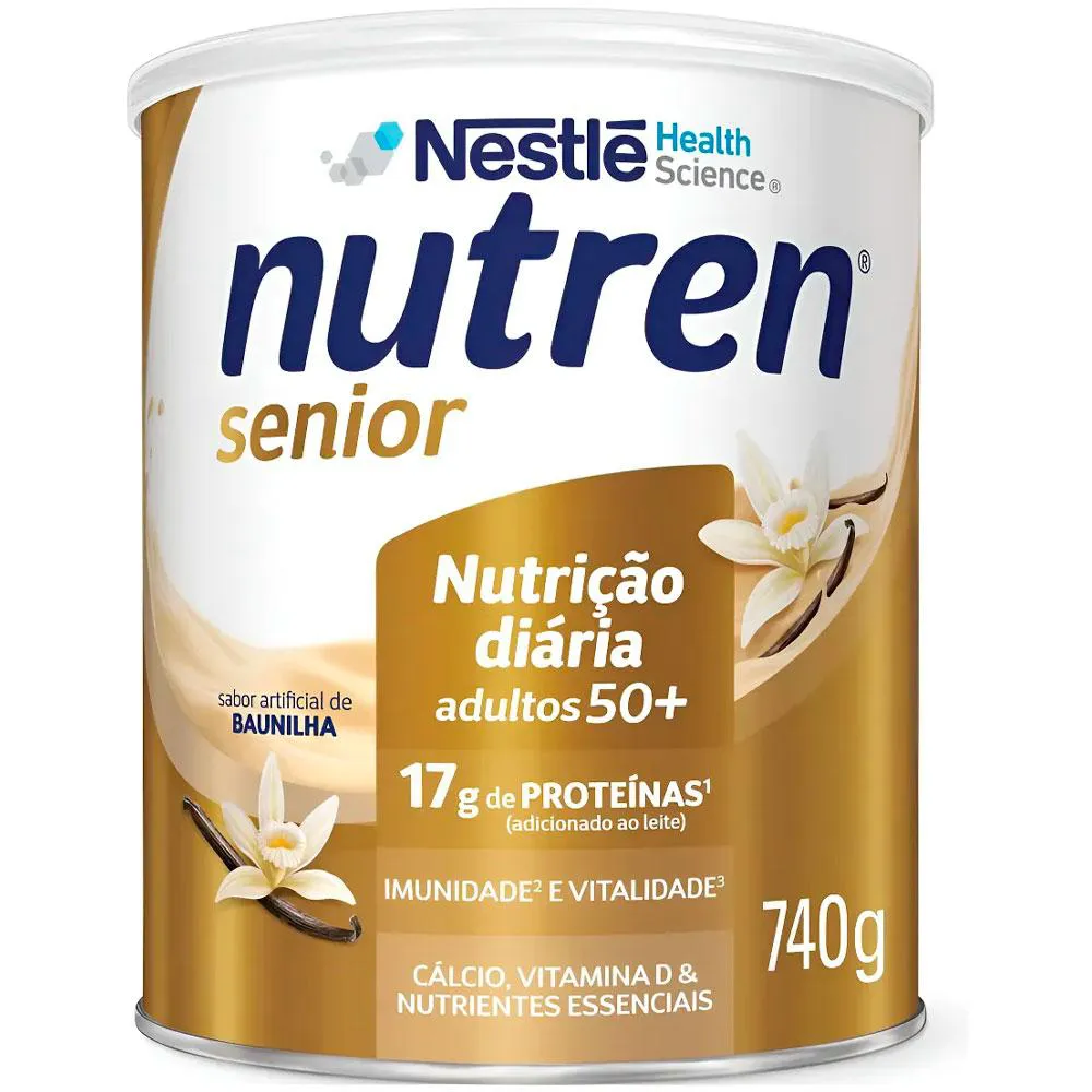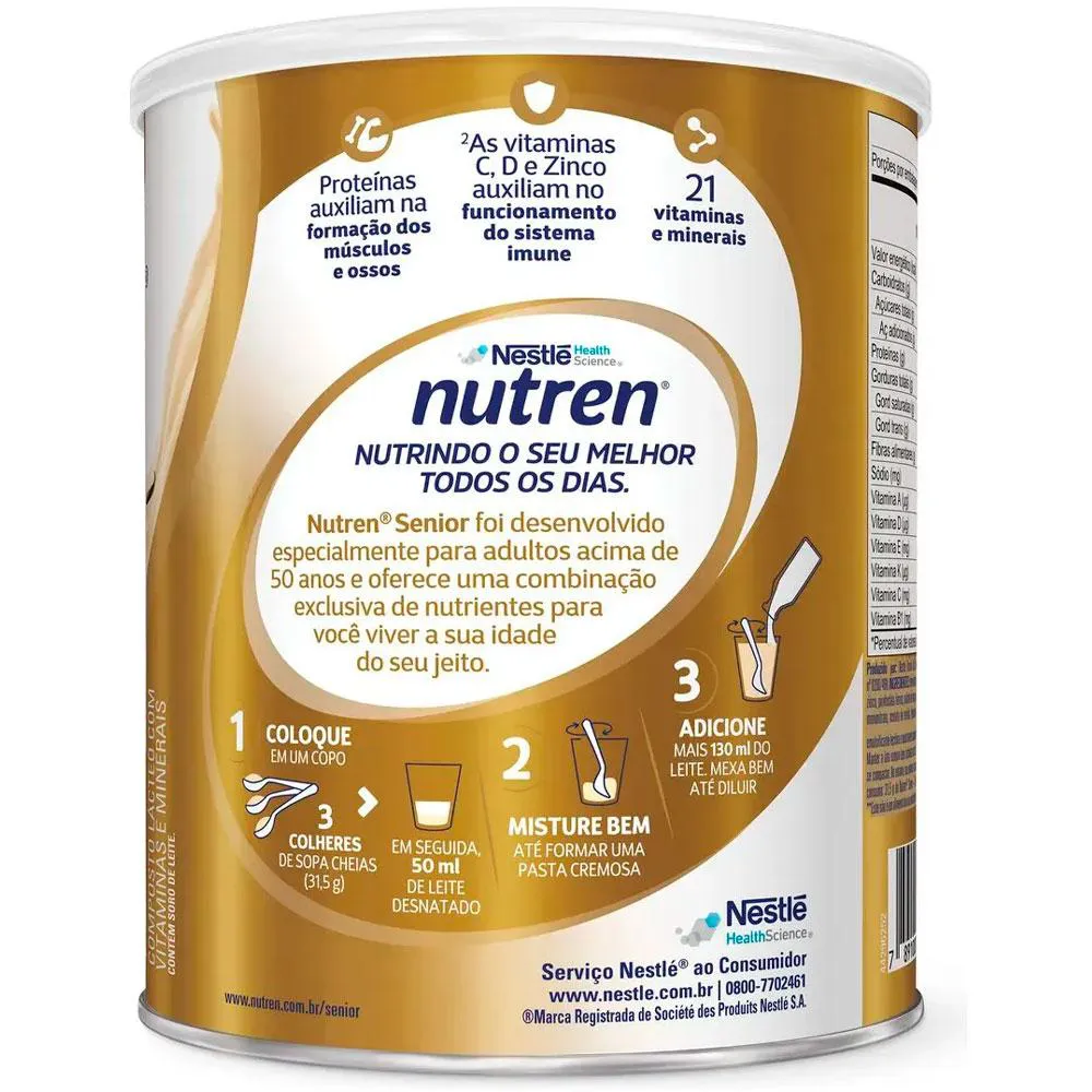 NUTREN SENIOR: A CHAVE PARA VIVER A MATURIDADE COM VITALIDADE E BEM-ESTAR, DO SEU JEITO. Nutren Senior é o complemento alimentar desenvolvido pela Nestlé especialmente para adultos acima de 50 anos. Sua fórmula exclusiva oferece uma combinação precisa de nutrientes essenciais para uma vida ativa e saudável na maturidade. PARA QUEM É INDICADO: Indicado para adultos acima de 50 anos que buscam manter uma rotina saudável e ativa, Nutren Senior é ideal para complementar as necessidades nutricionais nessa fase da vida. BENEFÍCIOS: Vitaminas do complexo B vitamina c, vitamina d e zinco Proteínas e cálcio Contém 21 vitaminas e minerais CUIDADOS E CONSERVAÇÃO: Mantenha a lata sempre bem fechada em local fresco, seco e inodoro. Consuma imediatamente após o preparo. Contém leite e derivados, derivados de soja e lactose. Não contém glúten. Advertências: "ESTE PRODUTO NÃO É UM MEDICAMENTO" "ESTE PRODUTO É UM SUPLEMENTO ALIMENTAR" "MANTENHA FORA DO ALCANCE DE CRIANÇAS" "NÃO EXCEDER A RECOMENDAÇÃO DIÁRIA DE CONSUMO INDICADA NA EMBALAGEM" Registro no M.S. nº Produto dispensado de registro RDC 240 de 2018