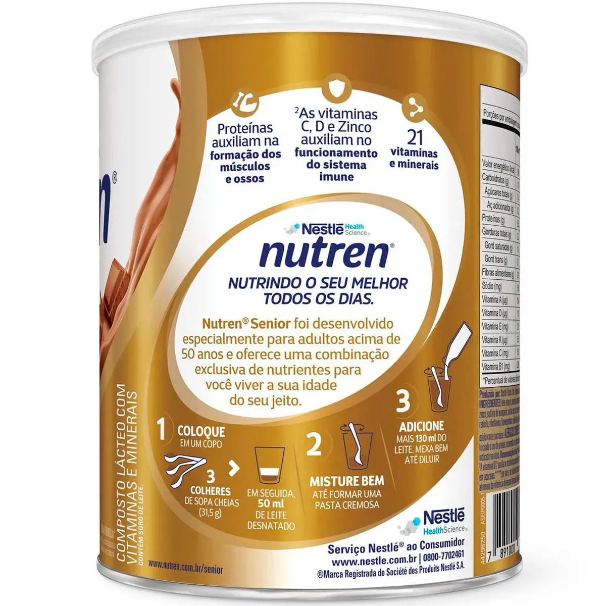 NUTREN SENIOR: A CHAVE PARA VIVER A MATURIDADE COM VITALIDADE E BEM-ESTAR, DO SEU JEITO. Nutren Senior é o complemento alimentar desenvolvido pela Nestlé especialmente para adultos acima de 50 anos. Sua fórmula exclusiva oferece uma combinação precisa de nutrientes essenciais para uma vida ativa e saudável na maturidade. PARA QUEM É INDICADO: Indicado para adultos acima de 50 anos que buscam manter uma rotina saudável e ativa, Nutren Senior é ideal para complementar as necessidades nutricionais nessa fase da vida. BENEFÍCIOS: Vitaminas do complexo B vitamina c, vitamina d e zinco Proteínas e cálcio Contém 21 vitaminas e minerais CUIDADOS E CONSERVAÇÃO: Mantenha a lata sempre bem fechada em local fresco, seco e inodoro. Consuma imediatamente após o preparo. Contém leite e derivados, derivados de soja e lactose. Não contém glúten. Advertências: "ESTE PRODUTO NÃO É UM MEDICAMENTO" "ESTE PRODUTO É UM SUPLEMENTO ALIMENTAR" "MANTENHA FORA DO ALCANCE DE CRIANÇAS" "NÃO EXCEDER A RECOMENDAÇÃO DIÁRIA DE CONSUMO INDICADA NA EMBALAGEM" Registro no M.S. nº Produto dispensado de registro RDC 240 de 2018
