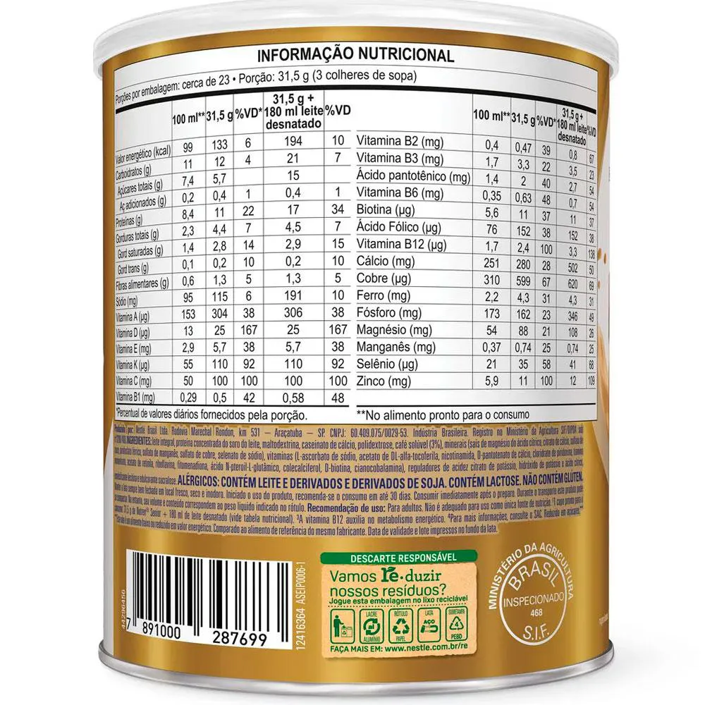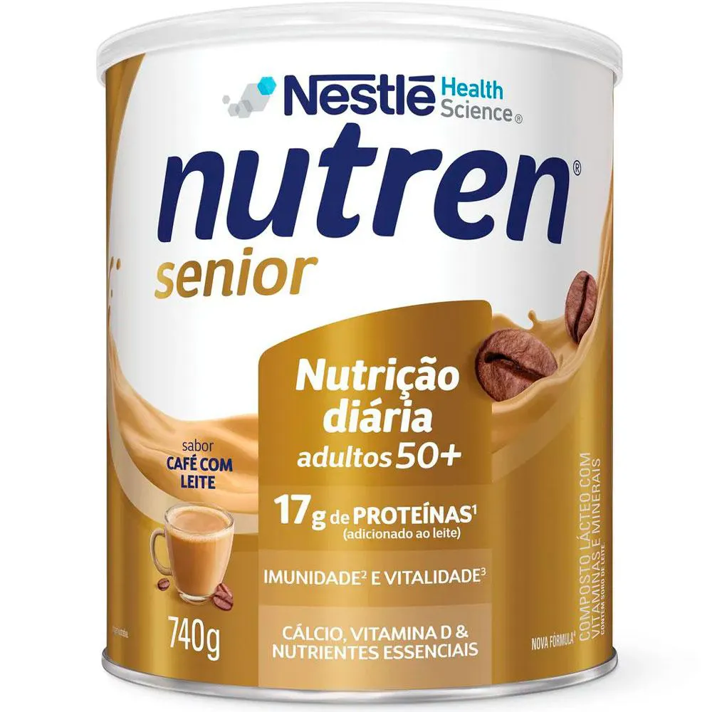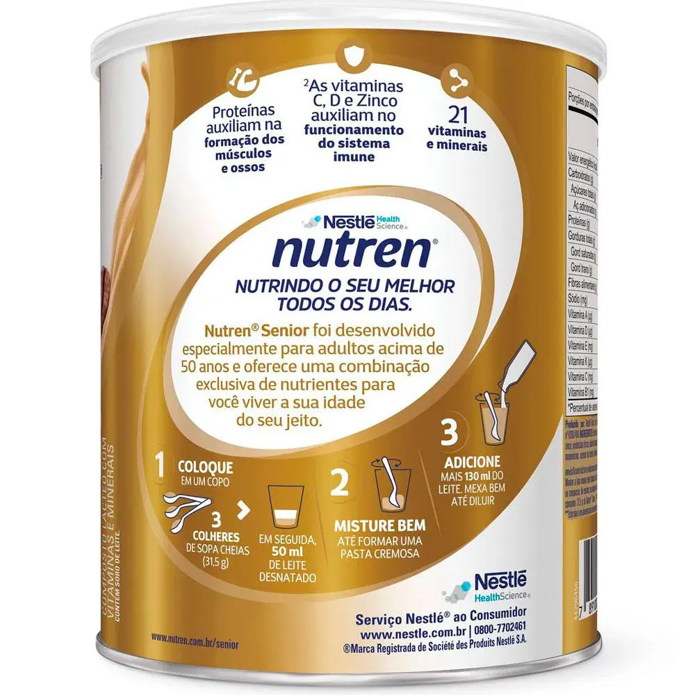 NUTREN SENIOR: A CHAVE PARA VIVER A MATURIDADE COM VITALIDADE E BEM-ESTAR, DO SEU JEITO. Nutren Senior é o complemento alimentar desenvolvido pela Nestlé especialmente para adultos acima de 50 anos. Sua fórmula exclusiva oferece uma combinação precisa de nutrientes essenciais para uma vida ativa e saudável na maturidade. PARA QUEM É INDICADO: Indicado para adultos acima de 50 anos que buscam manter uma rotina saudável e ativa, Nutren Senior é ideal para complementar as necessidades nutricionais nessa fase da vida. BENEFÍCIOS: Vitaminas do complexo B vitamina c, vitamina d e zinco Proteínas e cálcio Contém 21 vitaminas e minerais CUIDADOS E CONSERVAÇÃO: Mantenha a lata sempre bem fechada em local fresco, seco e inodoro. Consuma imediatamente após o preparo. Contém leite e derivados, derivados de soja e lactose. Não contém glúten. Advertências: "ESTE PRODUTO NÃO É UM MEDICAMENTO" "ESTE PRODUTO É UM SUPLEMENTO ALIMENTAR" "MANTENHA FORA DO ALCANCE DE CRIANÇAS" "NÃO EXCEDER A RECOMENDAÇÃO DIÁRIA DE CONSUMO INDICADA NA EMBALAGEM" Registro no M.S. nº Produto dispensado de registro RDC 240 de 2018