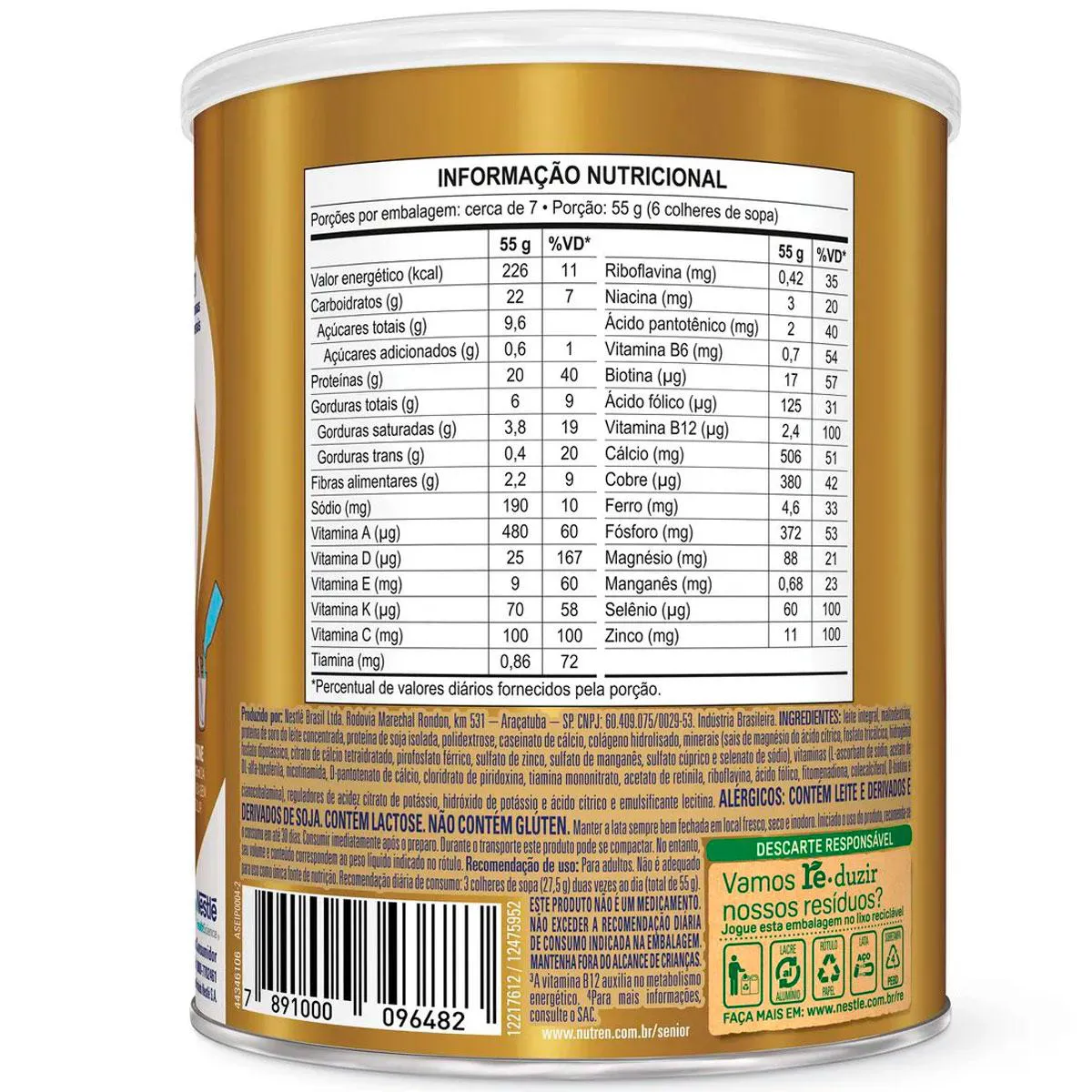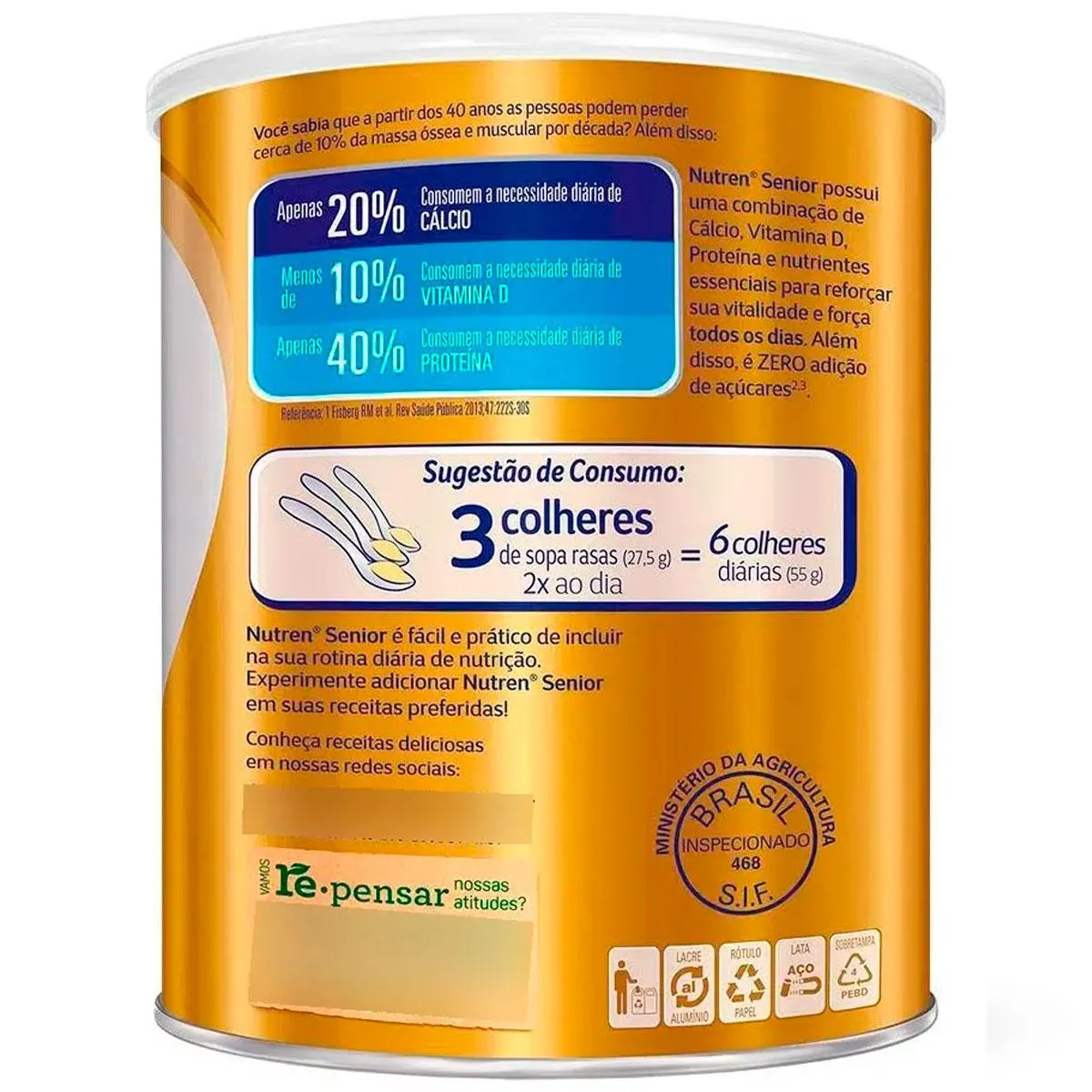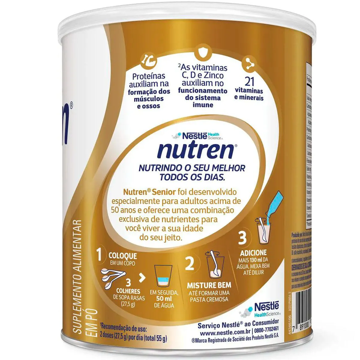 NUTREN SENIOR: A CHAVE PARA VIVER A MATURIDADE COM VITALIDADE E BEM-ESTAR, DO SEU JEITO. Nutren Senior é o complemento alimentar desenvolvido pela Nestlé especialmente para adultos acima de 50 anos. Sua fórmula exclusiva oferece uma combinação precisa de nutrientes essenciais para uma vida ativa e saudável na maturidade. PARA QUEM É INDICADO: Indicado para adultos acima de 50 anos que buscam manter uma rotina saudável e ativa, Nutren Senior é ideal para complementar as necessidades nutricionais nessa fase da vida. BENEFÍCIOS: Vitaminas do complexo B vitamina c, vitamina d e zinco Proteínas e cálcio Contém 21 vitaminas e minerais CUIDADOS E CONSERVAÇÃO: Mantenha a lata sempre bem fechada em local fresco, seco e inodoro. Consuma imediatamente após o preparo. Contém leite e derivados, derivados de soja e lactose. Não contém glúten. Advertências: "ESTE PRODUTO NÃO É UM MEDICAMENTO" "ESTE PRODUTO É UM SUPLEMENTO ALIMENTAR" "MANTENHA FORA DO ALCANCE DE CRIANÇAS" "NÃO EXCEDER A RECOMENDAÇÃO DIÁRIA DE CONSUMO INDICADA NA EMBALAGEM" Registro no M.S. nº Produto dispensado de registro RDC 240 de 2018