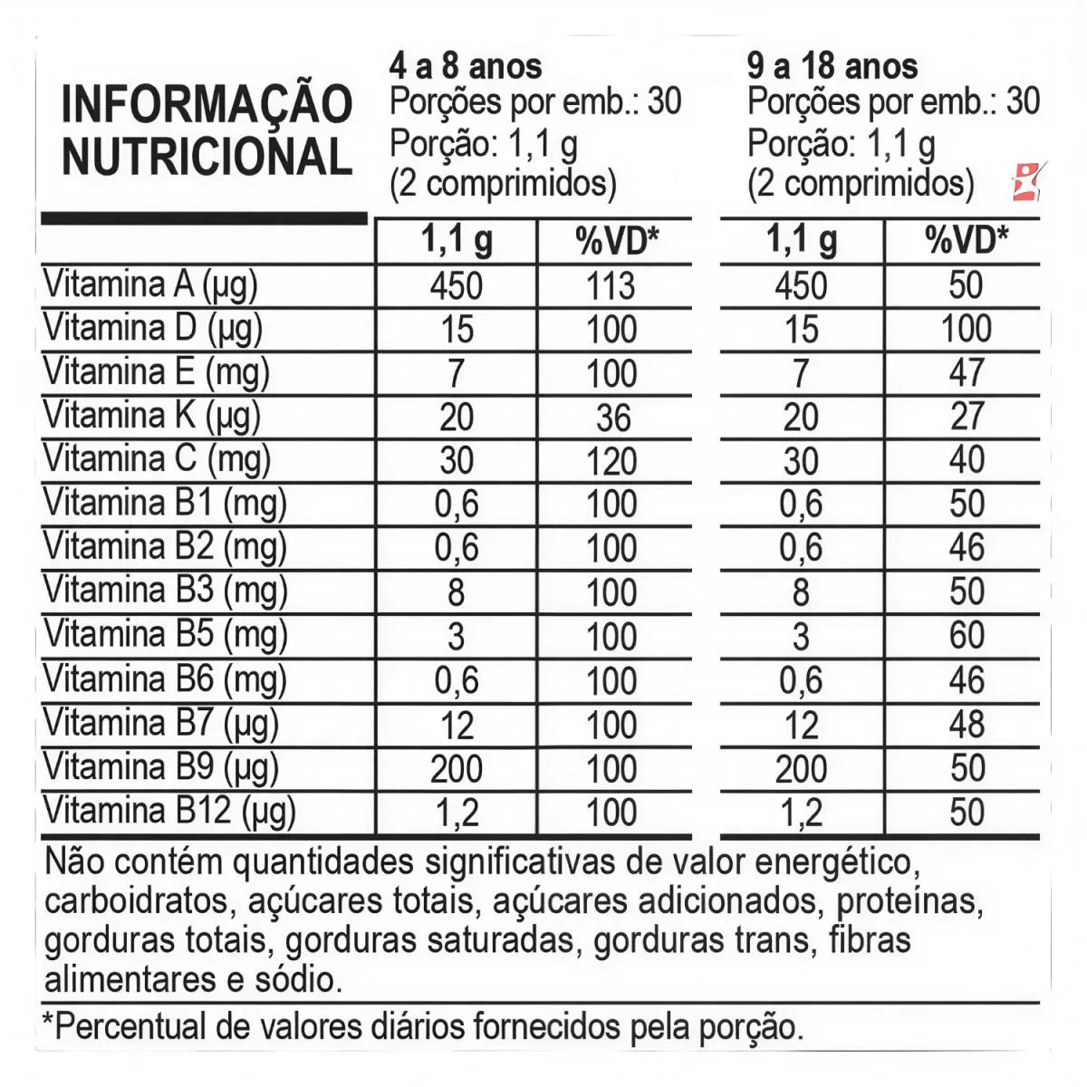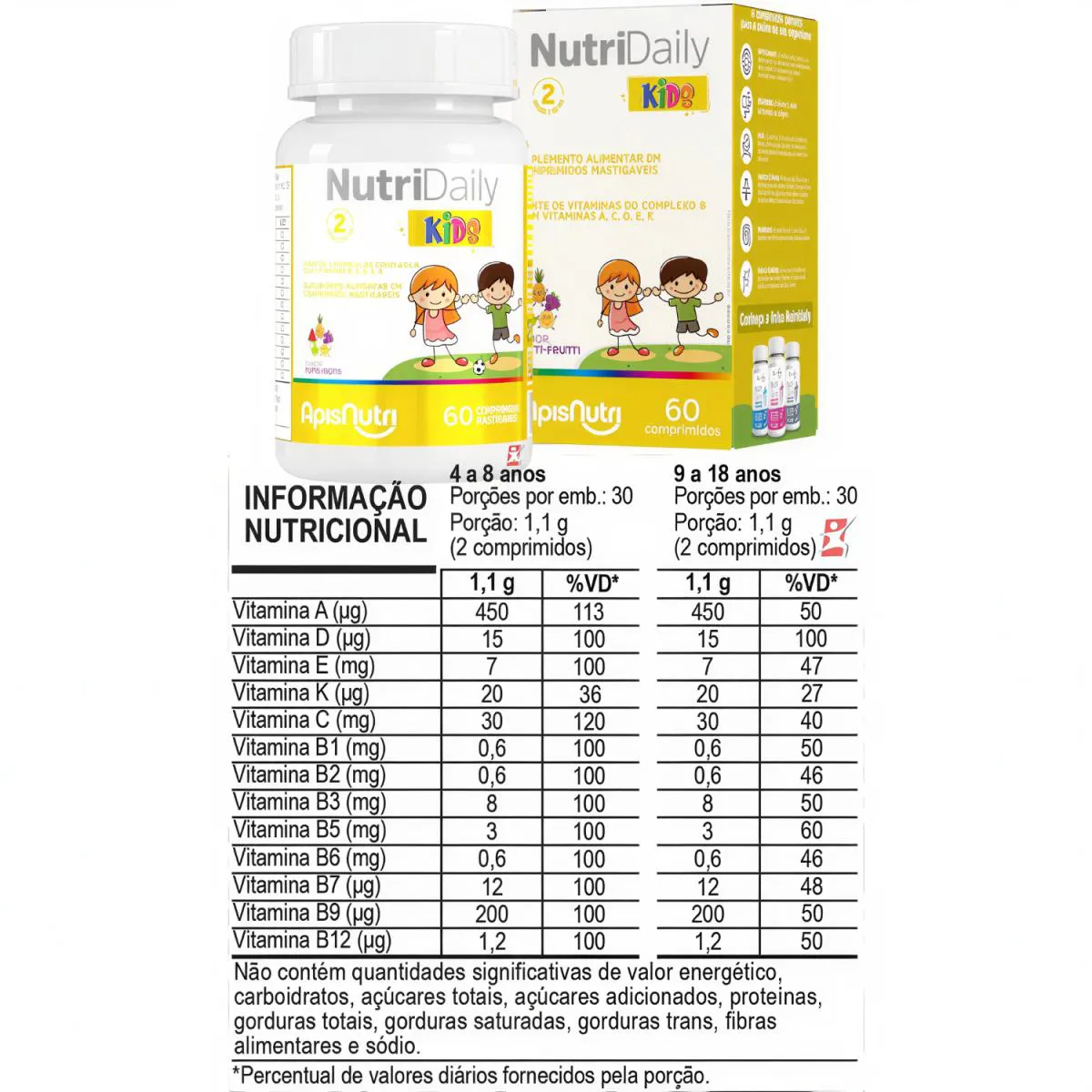 DESCRIÇÃO NutriDaily é um suplemento alimentar infantil que foi cuidadosamente elaborado para complementar e suprir, de forma saudável e prazerosa, as necessidades nutricionais vitamínicas de crianças a partir de 4 anos de idade, através de comprimidos mastigáveis com delicioso sabor de tutti frutti. BENEFÍCIOS - Melhora na Função Cognitiva: - Vitaminas do Complexo B ajudam a manter a saúde do trato digestivo, promovendo a produção de enzimas digestivas e absorção eficiente dos nutrientes. - Sistema Imunológico: - A combinação de Vitaminas A,C,D3,E e do Complexo B fortalece o Sistema Imunológico, ajudando a prevenir doenças e infecções. TABELA NUTRICIONAL Anexo nas imagens do anúncio. SUGESTÃO DE USO Ingerir 2 (dois) comprimidos ao dia, preferencialmente antes ou após as principais refeições. Recomendação de uso: pessoas do grupo populacional de 4 (quatro) a 8 (oito) anos e do grupo de 9 (nove) a 18 (dezoito) anos. INGREDIENTES Ácido ascórbico, acetato de DL-alfa-tocoferol, nicotinamida, D-pantotenato de cálcio, acetato de retinol, menaquinona-7, riboflavina, cloridrato de tiamina, cloridrato de piridoxina, ácido fólico, colecalciferol, D-biotina e cianocobalamina. Edulcorante: sorbitol. Agente de massa: celulose microcristalina. Antiumectante: estearato de magnésio. Aroma idêntico ao natural de tutti-frutti. RECOMENDAÇÕES & CUIDADOS - Este produto não é um medicamento. - Não exceder a recomendação diária de consumo indicada na embalagem. - Mantenha fora do alcance de crianças. - Manter a embalagem bem fechada e em local seco e fresco. Não expor à luz solar. - Não consuma o produto com o prazo de validade vencido. ALÉRGICOS: PODE CONTER TRIGO, CENTEIO, CEVADA E AVEIA. CONTÉM GLÚTEN. Pode conter traços dos ingredientes citados devido ao compartilhamento de máquinas. Entretando, práticas de limpeza e controle são adotadas para evitar a ocorrência da contaminação cruzada.