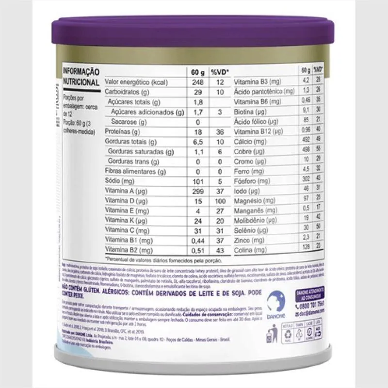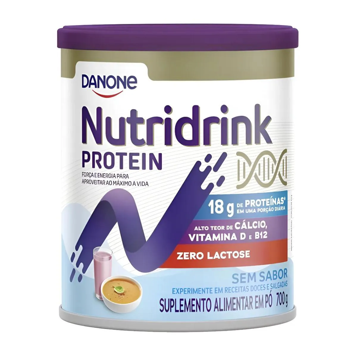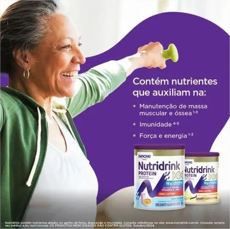 O que é e para que serve: O Nutridrink Protein Pó é um suplemento proteico completo e balanceado, que pode ser de consumo diário, conforme a recomendação do profissional de saúde. Contém alto teor de Proteínas, vitamina D e Cálcio, que contribuem para a saúde muscular e óssea, além de Zinco e vitamina c, que auxiliam na imunidade. Nutridrink Protein Pó pode ser ingerido por via oral ou sonda (enteral), conforme a recomendação do profissional de saúde. Não contém glúten, não contém lactose e a versão sem sabor também não contém sacarose (açúcar) Diferença de Nutridrink Protein Pó e Nutridrink Compact Ambos são nutricionalmente balanceados, com nutrientes que colaboram na saúde muscular e óssea, e auxiliam na imunidade. A diferença é que o Nutridrink Compact oferece alto aporte de nutrientes em baixo volume, contribuindo para a recuperação do estado nutricional para casos de restrição de volume.