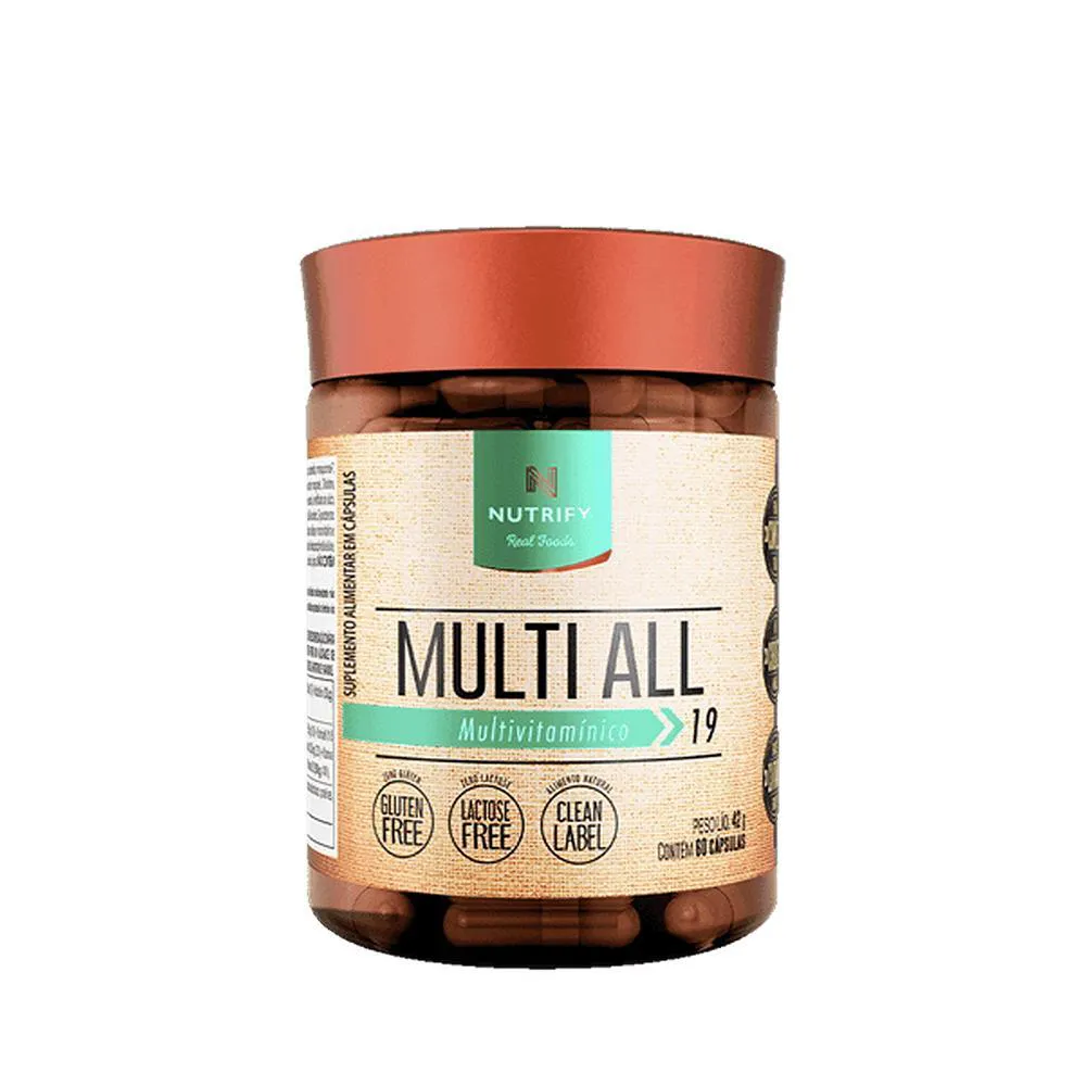 Os multivitamínicos são formulados para fornecer vitaminas e minerais essenciais, micronutrientes indispensáveis para a saúde e vitalidade.Além dos benefícios individuais de cada nutriente, a interação entre diferentes vitaminas e minerais potencializa sua absorção e eficácia no organismo. Como nem sempre é possível obter todos esses nutrientes apenas pela alimentação, o Multi All Nutrify oferece uma solução prática e segura para complementar a dieta e garantir um suporte nutricional completo.Multi All Nutrify é formulado com as principais vitaminas, como A, C, D e complexo B, na forma bioativa. Isso significa que elas já estão prontas para serem absorvidas e aproveitadas de forma mais efetiva pelo organismo.Multi All Nutrify oferta minerais importantes, como magnésio, zinco e selênio. Alguns deles são associados a aminoácidos, os chamados minerais quelados, que têm absorção otimizada.Com apenas duas cápsulas diárias, você atinge um incremento importante no consumo de 13 vitaminas e 6 minerais fundamentais para sua saúde e bem-estar.