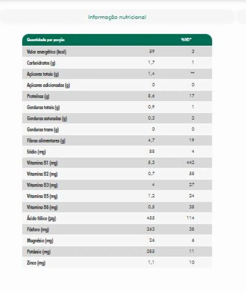 NÃO CONTÉM GLÚTEN.SUGESTÃO DE CONSUMO: Consumir 17,5 g (4 colheres de sopa) ao dia, ou conforme orientação profissional. Perfeito para enriquecer saladas, sopas, legumes, massas e outras receitas. Pode substituir o queijo ralado em preparações.