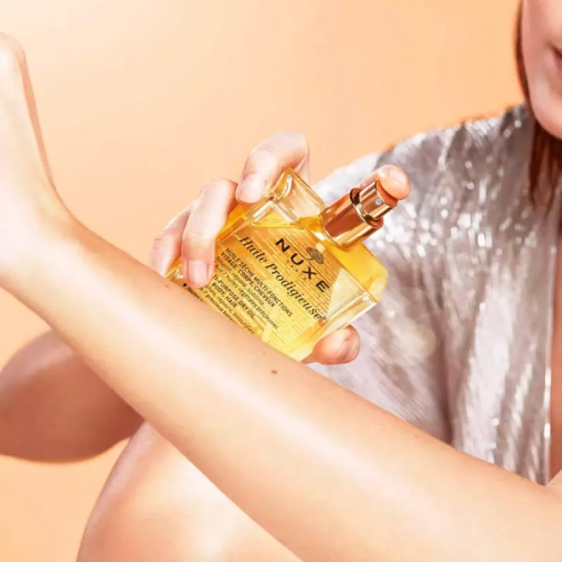 Nuxe Huile Prodigieuse Or nutre, repara e suaviza, proporcionando uma luminosidade elegante tanto à pele, quanto aos fios.
