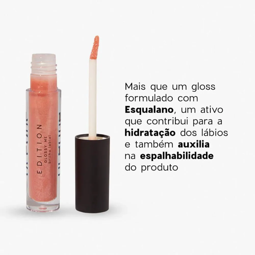 A fórmula do Glossy Me contém esqualeno, um ativo hidratante que ajuda a manter os lábios macios e suaves. Além disso, ele proporciona um acabamento cintilante, realçando a