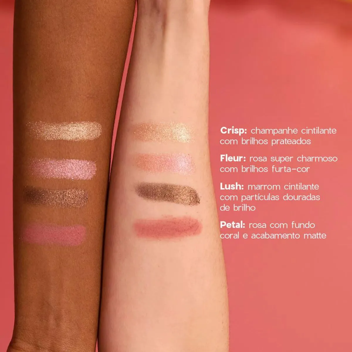 - Crisp: Champanhe cintilante com brilhos prateados, perfeita para iluminar.- Lush: Marrom profundo cintilante com partículas douradas, ideal para profundidade.- Fleur: Rosa charmoso com brilhos furta-cor, o grande destaque da paleta.- Petal: Rosa com fundo coral e acabamento matte, essencial para base e transição.