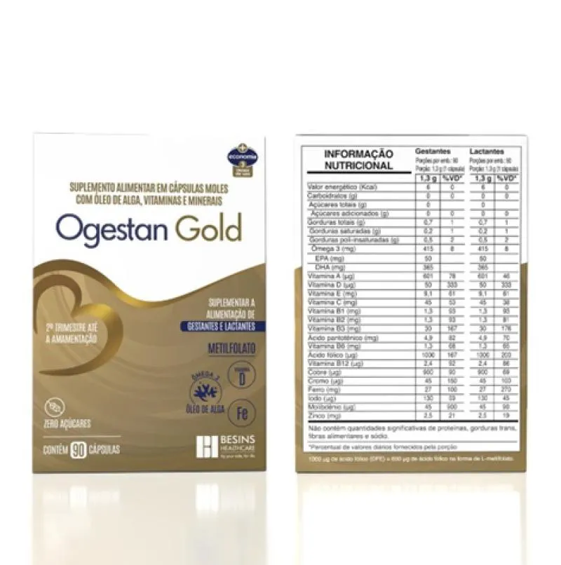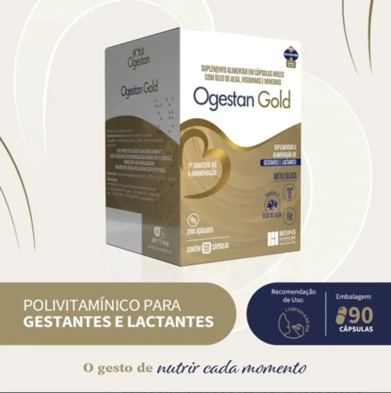 Ogestan Gold é um suplemento alimentar em cápsula. Sua fórmula contém uma combinação de vitaminas e minerais adequada às necessidades do organismo. É o único suplemento do mercado que associa vitaminas e minerais com Ômega-3 de alga marinha.   Principais componentes de Ogestan Gold:   DHA: fonte de ômega 3. Ferro. Ácido fólico. vitamina d. lodo. Metilfolat. Zinco.