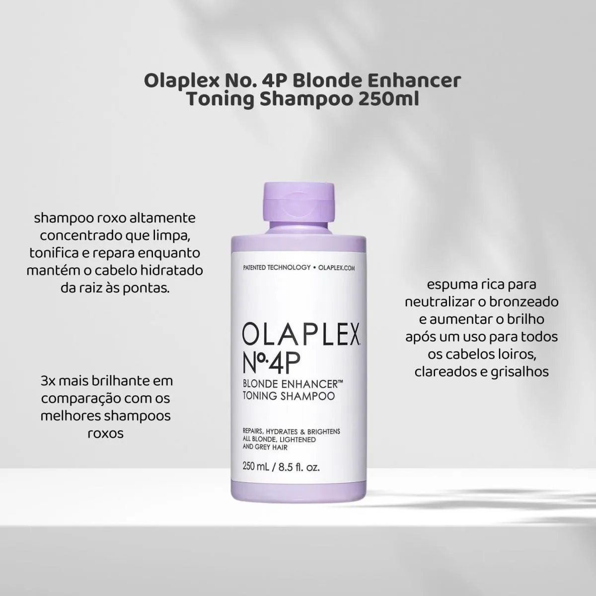 O Olaplex No. 4P Purple shampoo é um shampoo matizador que neutraliza tons amarelados em cabelos loiros, grisalhos e descoloridos. Sua fórmula mantém a saúde dos fios enquanto realça a cor. Modo de Uso: Aplique nos cabelos úmidos, deixe agir por 3 a 5 minutos e enxágue. Resultado: Cabelos matizados, brilhosos e com tom frio preservado.