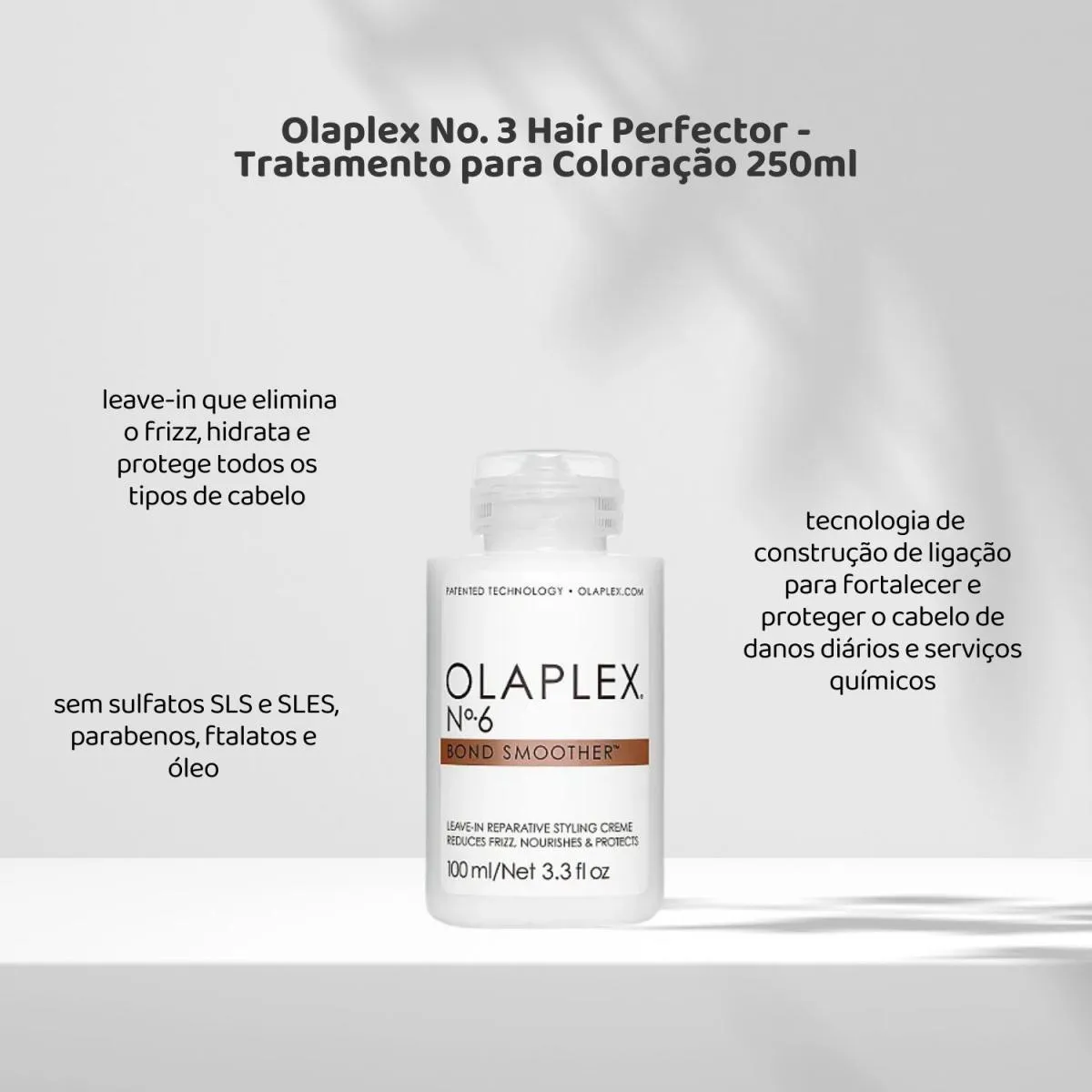 O Olaplex No. 6 Bond Smoother é um leave-in nutritivo que reduz o frizz por até 72 horas, melhora a textura e protege os fios contra danos térmicos. Modo de Uso: Aplicar nos cabelos úmidos ou secos, espalhando no comprimento e pontas. Resultado: Cabelos mais alinhados, macios e protegidos contra agressões externas.