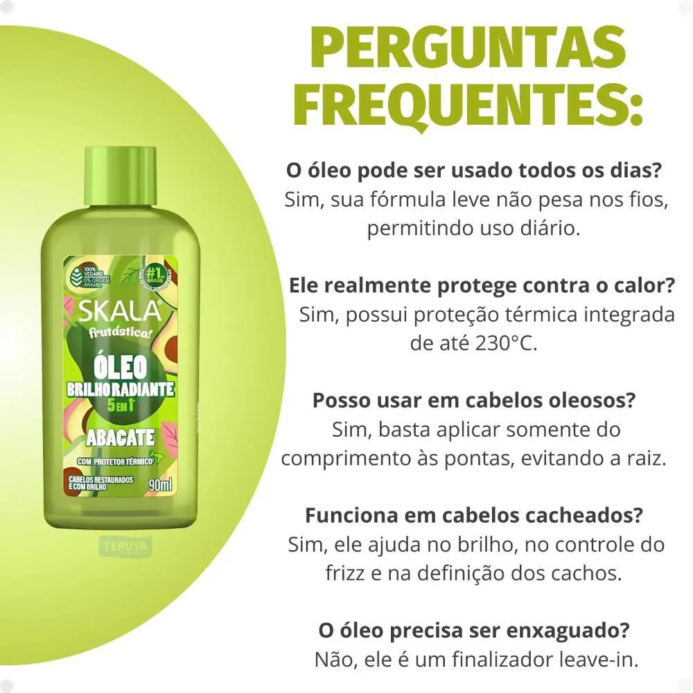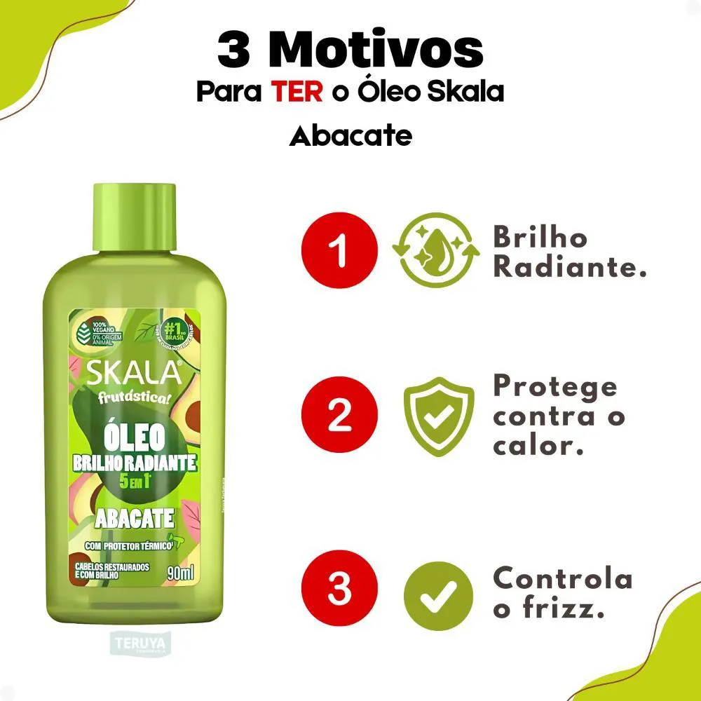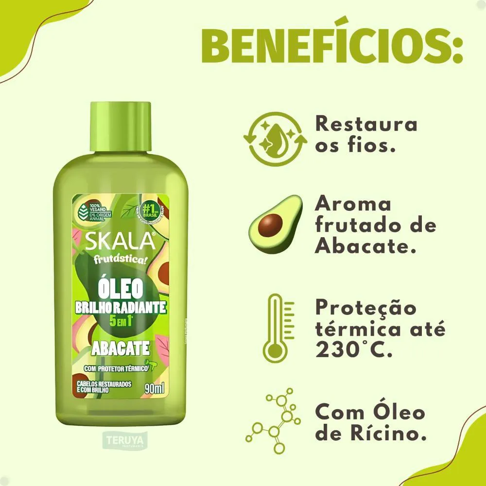 Transforme seus cabelos com o Óleo Brilho Radiante Skala Frutástica! 5 em 1 Abacate Com Protetor Térmico 90ml, a solução completa para fios que buscam vitalidade e proteção. Desenvolvido pela SKALA, este óleo capilar inovador oferece múltiplos benefícios em um único produto, ideal para quem deseja um tratamento eficaz e prático. Com a riqueza do abacate e uma fórmula 5 em 1, este óleo não só proporciona um brilho intenso e radiante, mas também atua como um poderoso protetor térmico, defendendo seus cabelos dos danos causados por ferramentas de calor. Experimente a sensação de cabelos nutridos, protegidos e visivelmente mais saudáveis.Benefícios Essenciais para Seus Cabelos
