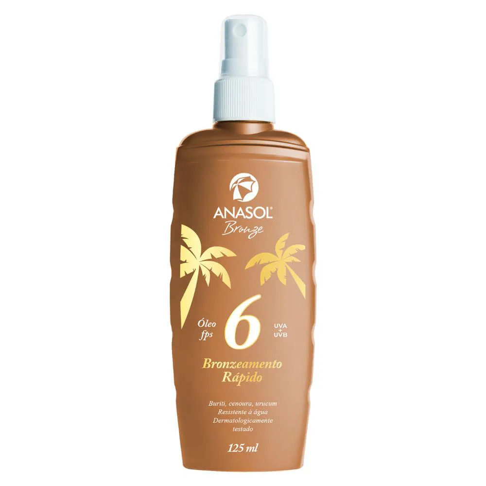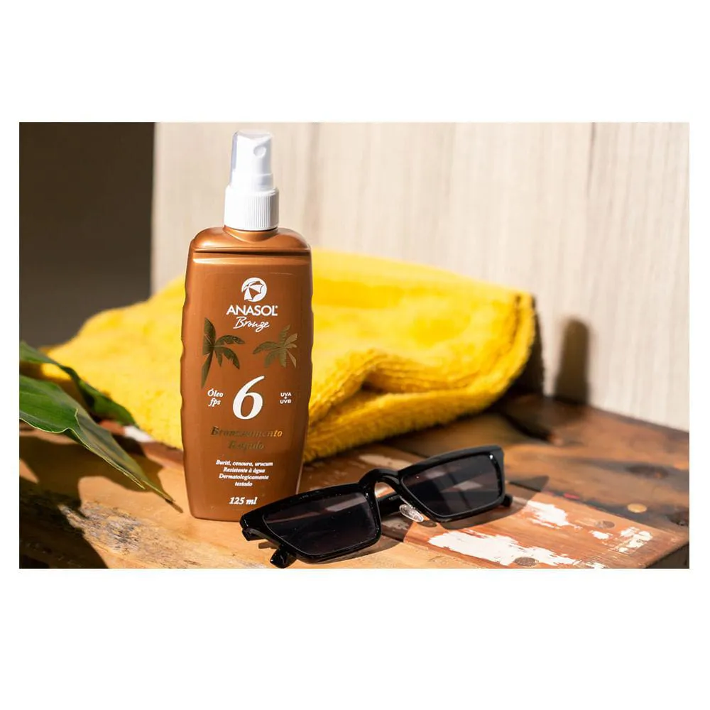 O Óleo Bronzeador Spray Fps6 Anasol é um produto cosmético finíssimo com toque seco e suave, enriquecido com extratos naturais de Buriti, Cenoura e Urucum. É um óleo bronzeador desenvolvido para proteção solar.