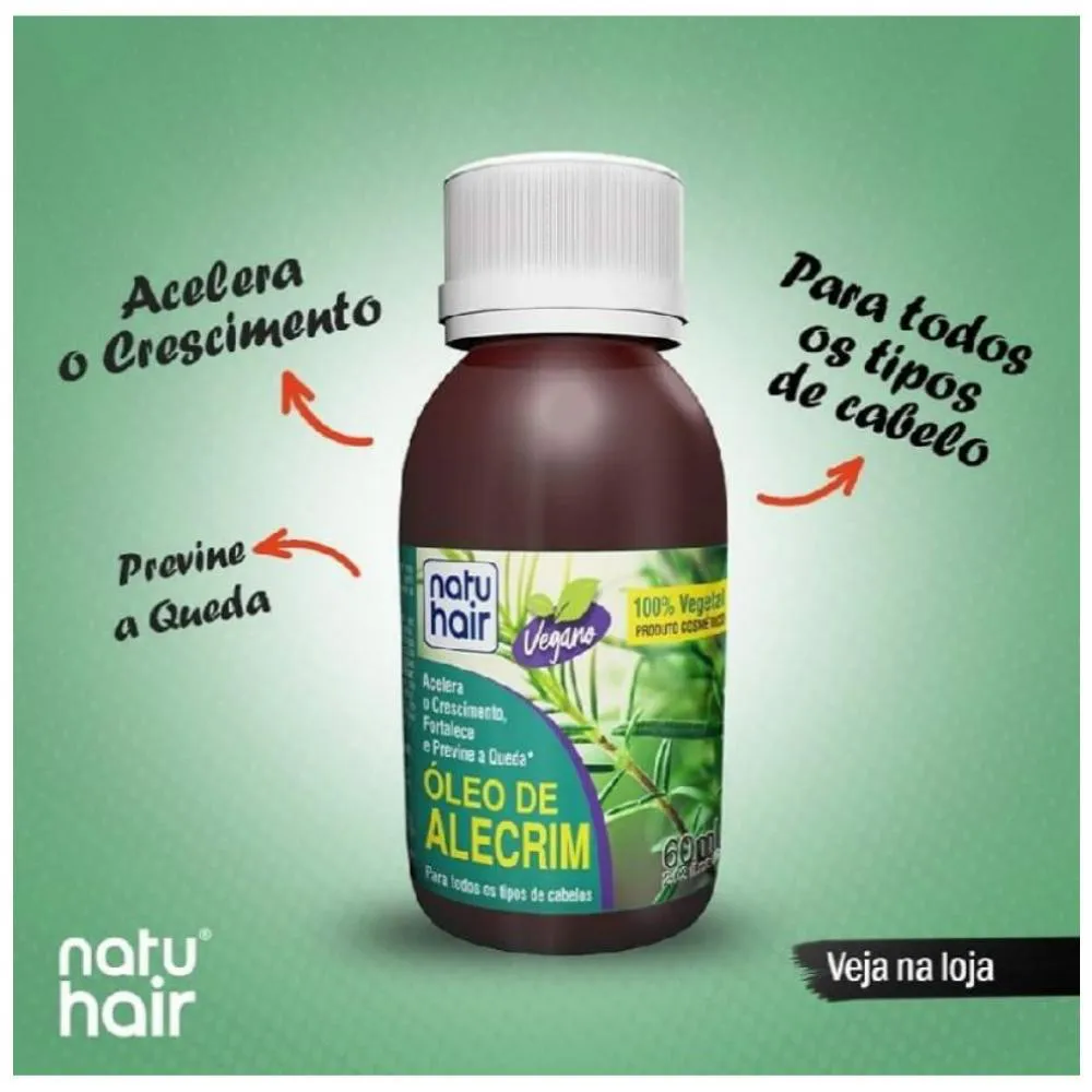 OLEO CAPILAR DE ALECRIM NATU HAIR 60ML O Óleo de Alecrim Acelera o crescimento, fortalece e previne a queda. Modo de usar: Adicione uma tampa do Óleo/Solução Capilar em sua máscara de tratamento e aplique em toda extensão dos cabelos limpos e úmidos. Deixe agir por 5 minutos. Enxágue com bastante água e finalize como de costume. Dica de Umectação: Para fazer umectação, aplique algumas gotas do Óleo/Solução Capilar nos cabelos e espalhe massageando delicadamente em toda extensão dos fios. Coloque uma touca plástica, deixe agir de 20 minutos até 08 horas (umectação noturna) e depois lave como de costume. Composição: Rosmarinus Officinalis Leaf Oil, Parfum, Phenoxyethanol, BHT, D-Limonene, Hexyl Cinnamal. Precauções: Uso externo. MANTER FORA DO ALCANCE DE CRIANÇAS. Manter o produto em local fresco e ventilado. Evitar o contato do produto com os olhos. Em caso de contato com os olhos, enxague imediatamente com água em abundância e, se necessário, procure orientação médica. Não aplique caso o couro cabeludo apresente irritações ou escoriações. Em caso de eventual irritação do couro cabeludo, suspender o uso. Não ingerir.