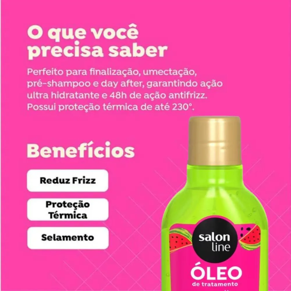 Desenvolvido para proporcionar nutrição leve, brilho imediato e toque sedoso, o Óleo Multy Melancia Salon Line hidrata profundamente os fios sem pesar, garantindo maciez, luminosidade e movimento natural desde a primeira aplicação.Sua fórmula multifuncional de rápida absorção atua diretamente na fibra capilar, ajudando a selar as cutículas, reduzir o frizz e prevenir pontas duplas, enquanto revitaliza os fios opacos e ressecados. Ideal para uso diário, entrega um acabamento leve, sem oleosidade excessiva.Versátil, pode ser utilizado como finalizador, reparador de pontas ou pré-shampoo, adaptando-se facilmente à rotina de cuidados e potencializando tratamentos capilares. Indicado para todos os tipos de cabelo, especialmente fios ressecados, sem vida ou com necessidade de nutrição equilibrada.Livre de sulfatos, petrolatos, parabenos e óleo mineral, o Óleo Multy Melancia é vegano e liberado, oferecendo um tratamento eficaz, seguro e com fragrância refrescante de melancia.