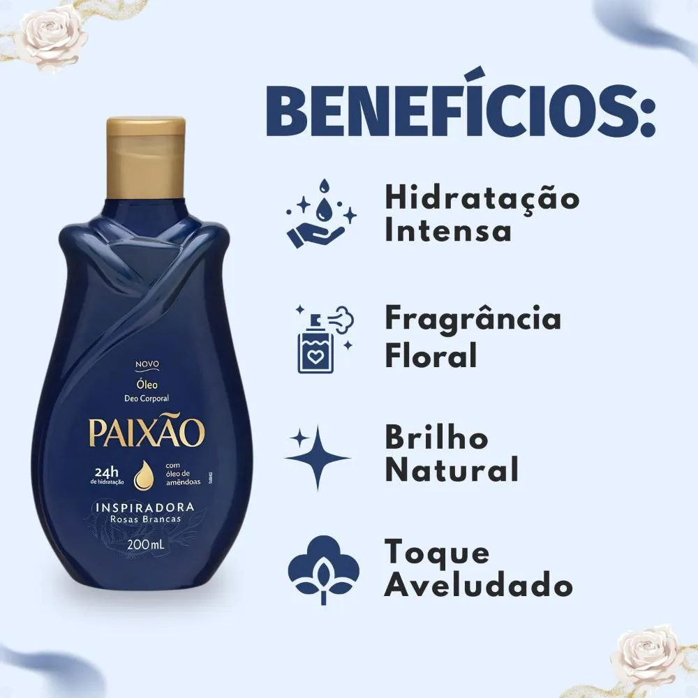 Desperte seus sentidos e envolva sua pele com o Óleo Corporal Paixão Inspiradora Rosas Brancas 200ml. Desenvolvido pela renomada marca PAIXÃO, este óleo deo corporal é a escolha perfeita para quem busca hidratação intensa e uma perfumação duradoura. Enriquecido com o nobre óleo de amêndoas Paixão, ele garante uma pele macia, luminosa e profundamente hidratada por até 24 horas. Sua fragrância sofisticada, com notas de lavanda, alecrim e bergamota, que desabrocham em um fundo de madeiras nobres e especiarias, proporciona uma comprovada sensação de prazer e bem-estar. Ideal para todos os tipos de pele, este óleo é um convite diário ao cuidado e à beleza, transformando seu ritual de hidratação em um momento único de prazer e sofisticação. Sinta a inspiração das rosas brancas em cada toque, revelando a beleza natural da sua pele.Benefícios Principais