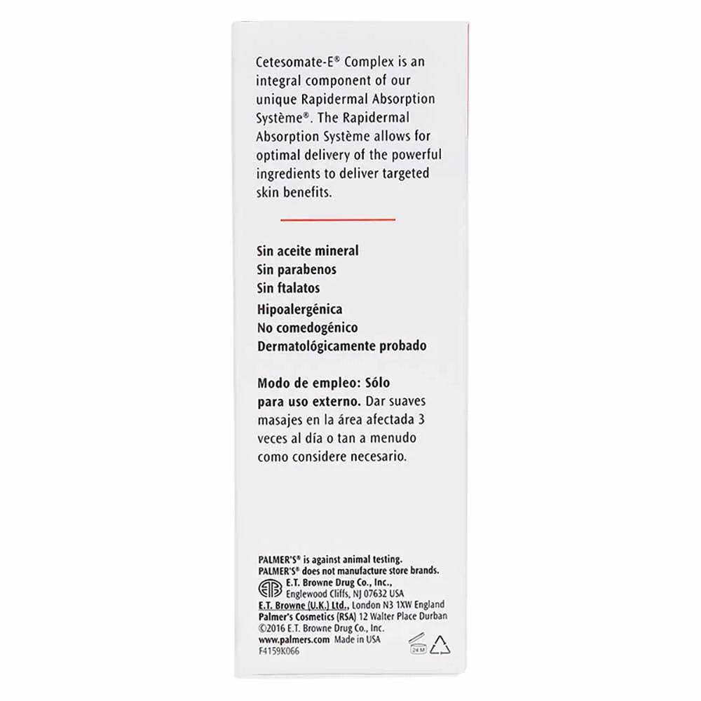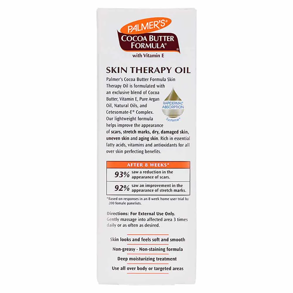 Contém o mais puro cacau, vitamina E, óleo de gergelim, óleo de canola, óleo de rosa mosqueta e complexo Cetesomate-E, que confere ao produto o exclusivo “toque seco” e não oleoso. O Óleo Corporal Palmer’s Cocoa Butter possui rápida absorção com máximo aproveitamento; Não mancha, você pode se vestir logo após a aplicação! Um incrível óleo para tratar a sua pele.