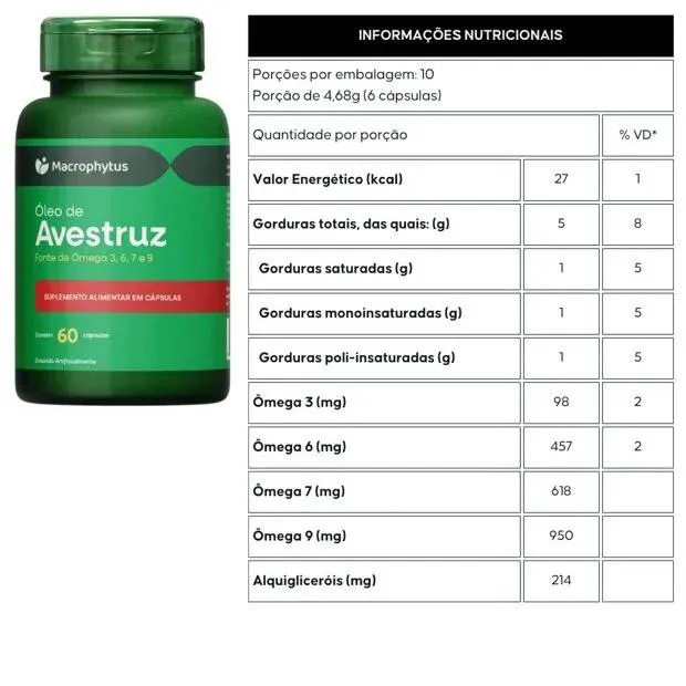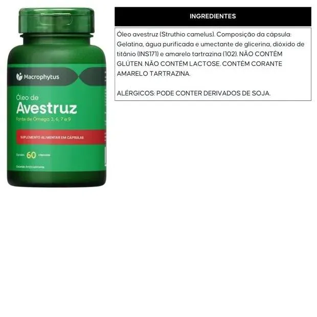 Óleo de Avestruz 780mg (ômega 3, 6, 7 e 9) 60 Cápsulas - Macrophytus