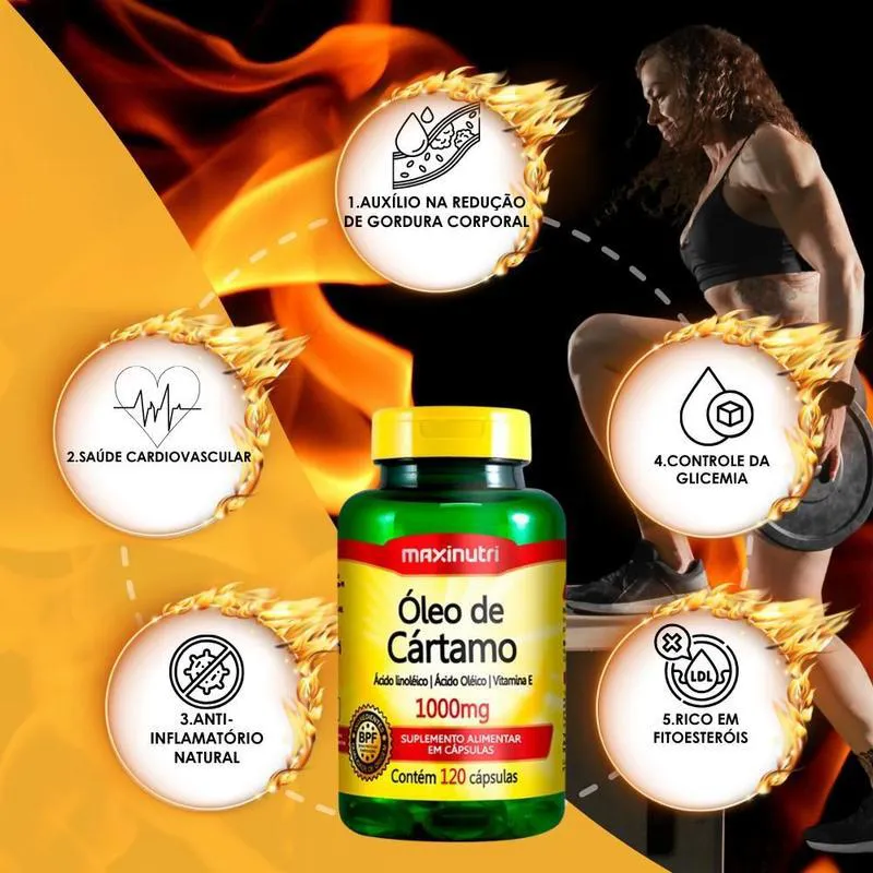 O Óleo de Cártamo é um suplemento alimentar essencial, extraído das sementes da planta Carthamus tinctorius L., uma fonte poderosa de ácidos graxos poli e monoinsaturados. Sua fórmula é naturalmente rica em Ácido Linoleico (Ômega 6) e Ácido Oleico (Ômega 9), além de ser enriquecida com vitamina e, um potente antioxidante. Desenvolvido para complementar sua rotina de vida saudável, o Óleo de Cártamo é muito apreciado por auxiliar na mobilização da gordura corporal, contribuindo para um metabolismo mais ativo e favorecendo a definição muscular quando associado a uma dieta equilibrada e exercícios físicos regulares. Benefícios em Destaque: - Auxilia na Redução da Gordura Corporal: Contribui para a utilização da gordura acumulada como fonte de energia. - Rico em Ômega 6 e 9: Ácidos graxos essenciais importantes para o funcionamento do organismo. - Ação Antioxidante: A vitamina E presente na composição ajuda a proteger as células contra os danos dos radicais livres. - Contribui para a Definição Muscular: Apoia o metabolismo e a manutenção da massa magra.