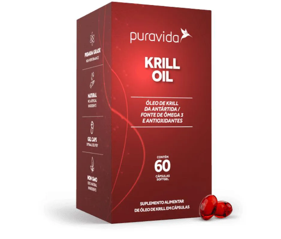 O Krill Oil Puravida é uma fonte excepcional de ácidos graxos ômega 3, fosfolipídios e antioxidantes, incluindo a poderosíssima astaxantina, e colina. Este óleo extremamente puro vem das águas geladas do oceano Ártico e preserva integralmente suas características devido a um cuidadoso processo de extração. O Krill é um pequeno crustáceo das regiões polares. Seu aspecto é semelhante ao de um micro-camarão. Por ser abundante e renovável, serve como biomassa alimentar para uma grande variedade de espécies marinhas dos polos norte e sul – especialmente baleias. Oferece um óleo que contém os mesmos ácidos graxos essenciais do óleo de peixe, os ômega 3 EPA e DHA, além de elementos adicionais como fosfolipídios, traços de astaxantina (que é o que deixa este óleo naturalmente avermelhado), além de colina. O óleo de Krill é uma ótima alternativa para quem não pode ou não quer consumir óleo de peixe. O ômega 3 DHA está presente em todas as células do