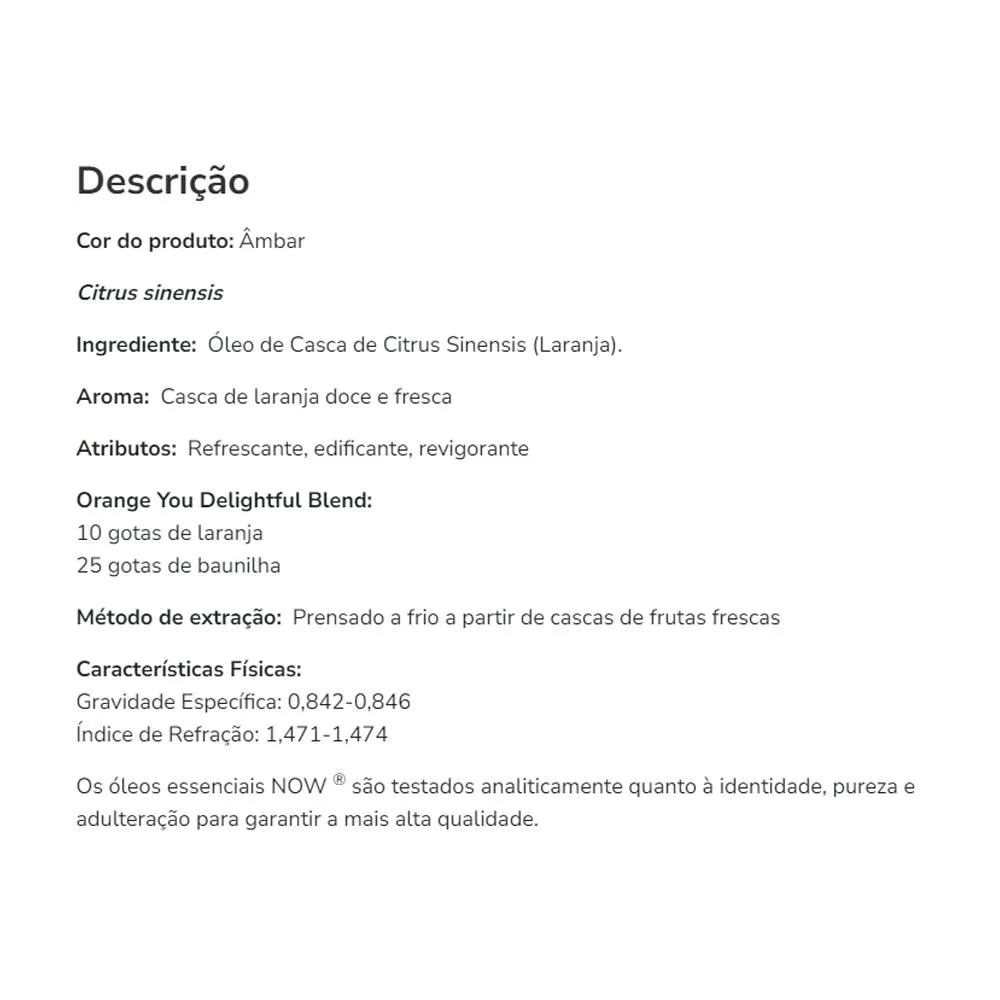 1. Principal Suporte: Desfrute do frescor cítrico proporcionado pelo Óleo de Laranja Now Foods, uma adição revigorante para a sua rotina de bem-estar e cuidados pessoais.