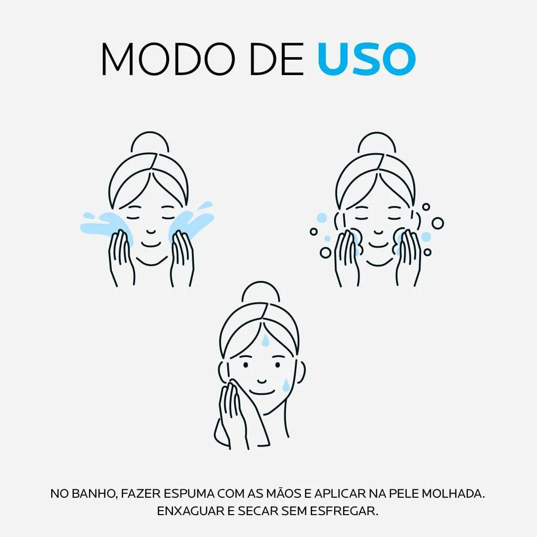 - Aplicar quantidade suficiente na palma da mão e aplicar sobre a pele previamente molhada. Massagear suavemente, enxaguar e secar sem esfregar a pele.