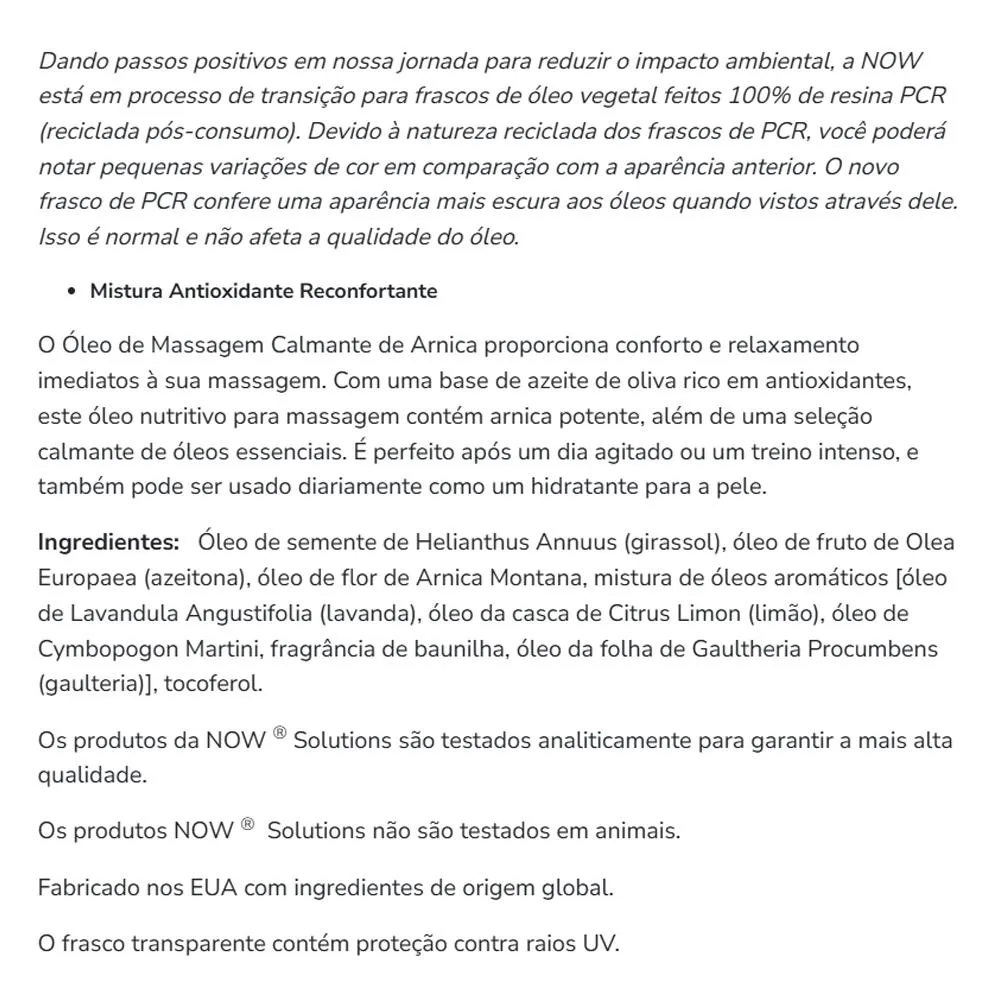 Óleo de Massagem Calmante de Arnica Now Foods 237ml é uma mistura de óleos vegetais com extrato de arnica, formulado para uso externo, proporcionando sensação de conforto durante massagens, com textura leve e absorção rápida.