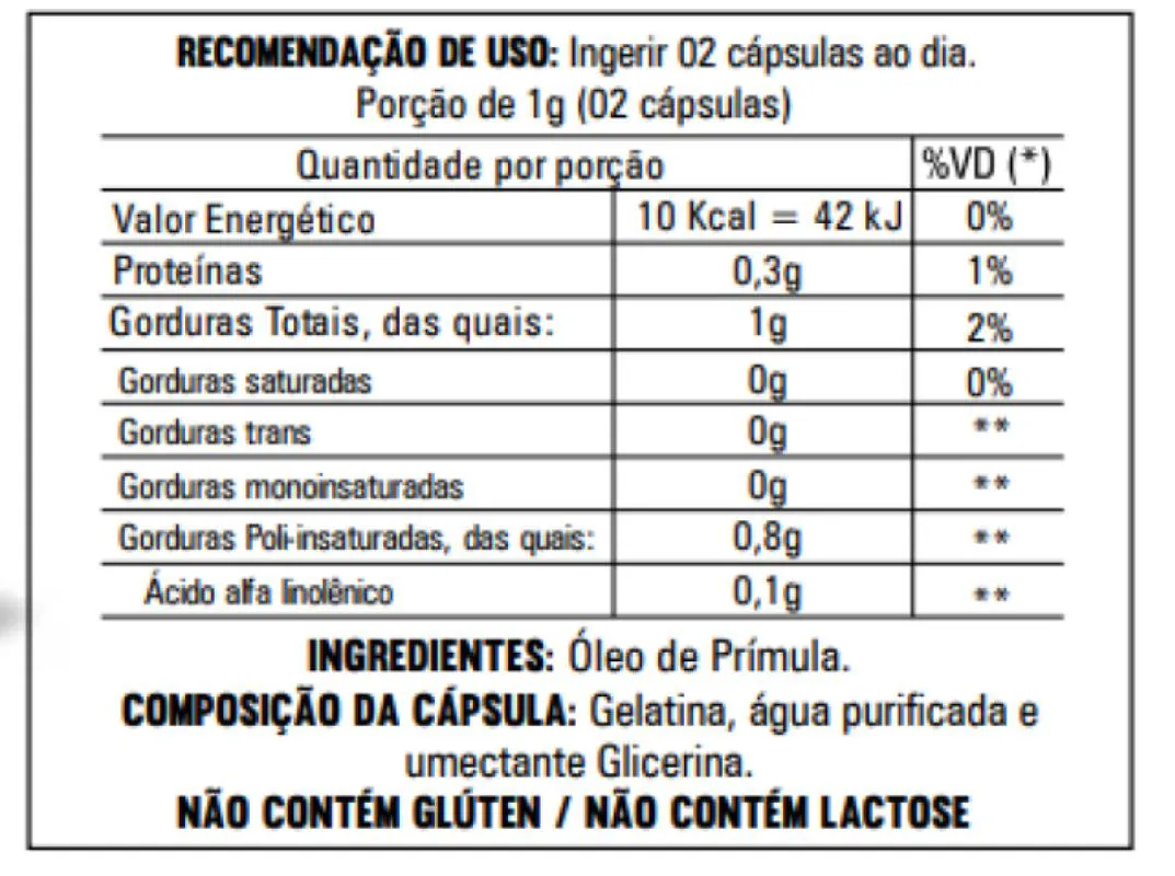 RECOMENDAÇÃO DE USO: Ingerir 2 (duas) cápsulas ao dia. INFORMAÇÃO NUTRICIONAL: Valor energético 10kcal (0,5% VD) • Proteínas 0,3g (0,6% VD) • Gorduras totais 1g (1,5% VD) • Gorduras saturadas 0g (0% VD) • Gorduras monoinsaturadas 0g (0% VD) • Gorduras poli-insaturadas 0,8g (4% VD) • Ácido Alfa-linolênico 0,1g. *Percentual de valores diários fornecidos pela porção. INGREDIENTES: Óleo de Prímula (Oenothera biennis L.). Composição da cápsula: gelatina, água purificada e umectante glicerina. NÃO CONTÉM GLÚTEN