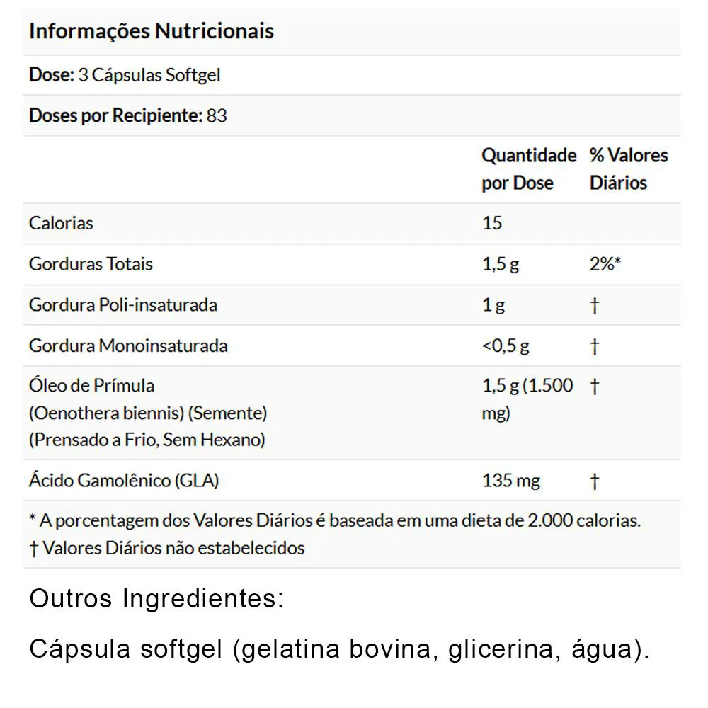 O Óleo de Prímula é um suplemento extraído das sementes da planta prímula, rica em ácidos graxos essenciais, especialmente o ácido gama-linolênico (GLA). Cada softgel contém 500mg deste óleo, proporcionando uma maneira prática de complementar a dieta com esses ácidos graxos importantes para o equilíbrio do organismo.