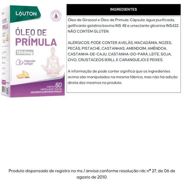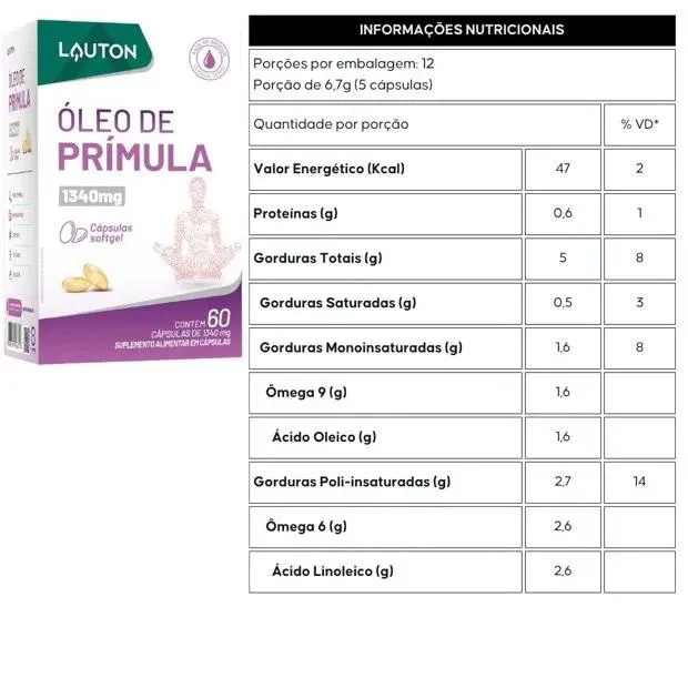 Uma nutrição equilibrada tem um papel muito importante na qualidade de vida. Com o ritmo acelerado de muitas pessoas, às vezes, é muito difícil prestar atenção a todos os requisitos que o corpo precisa para estar saudável e forte. Neste sentido, os suplementos cumprem a função de complementar a alimentação e ajudam a obter as vitaminas, minerais, proteínas e outros componentes indispensáveis para o correto funcionamento do organismo.COMO TOMAR Sugere-se à ingestão de 5 (cinco) cápsulas deste produto ao dia, preferencialmente junto das principais refeições, ou de acordo com orientação profissional.TABELA NUTRICIONAL Porção de 6,7g (5 cápsulas) Valor Energético 47kcal Proteínas 0,6g Gorduras Totais 5g Gorduras saturadas 0,5gGorduras Trans 0g Gorduras monoinsaturadas 1,6g Ômega 9 1,6g Ácido Oleico 1,6g Gorduras poli-insaturadas 2,7g Ômega 6 2,6g Ácido Linoléico 2,6g fibras Alimentares 0g Sódio 0g INGREDIENTES Óleo de Girassol e Óleo de Prímula. Cápsula: água purificada, gelificante gelatina bovina INS 48 e umectante glicerina INS422. NÃO CONTÉM GLÚTEN.ALÉRGICOS: PODE CONTER AVELÃS, MACADÂMIA, NOZES, PECÃS, PISTACHE, CASTANHAS, AMENDOIM, AMÊNDOA, CASTANHA-DE-CAJU, CASTANHA-DO-PARÁ, LEITE, SOJA, OVO, CRUSTÁCEOS (KRILL E CARANGUEJO) E PEIXES. A informação de pode conter significa que os ingredientes acima são manipulados na mesma fábrica, mas não há adição direta dos mesmos no produto.ANVISA:"Produto indicado para maiores de 19 anos""Este produto não é um medicamento.""Não exceder a recomendação diária de consumo indicada na embalagem.""Mantenha fora do alcance de crianças.""Este produto não deve ser consumido por gestantes, lactantes e crianças.""Produto dispensado de registro conforme RDC 240/2018."