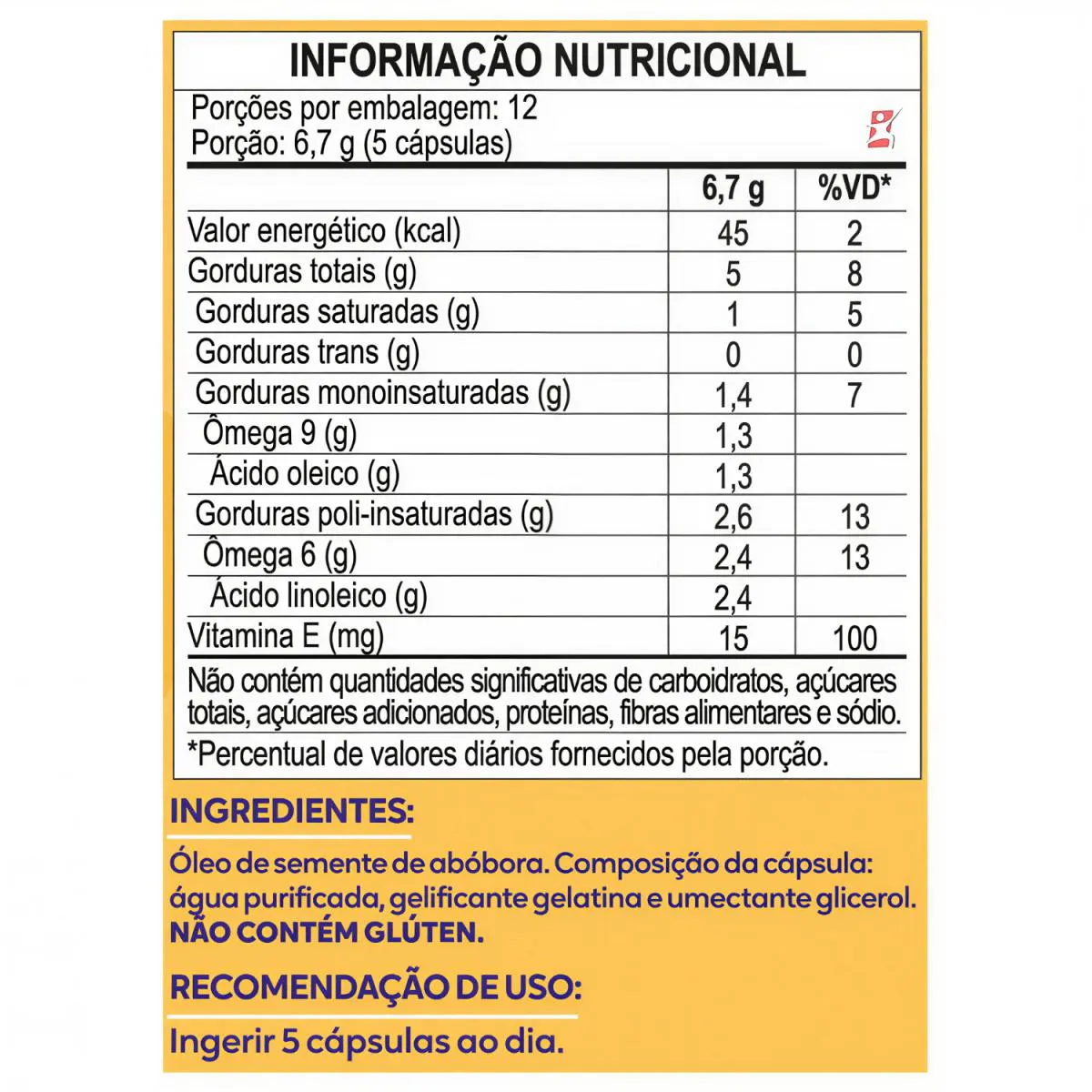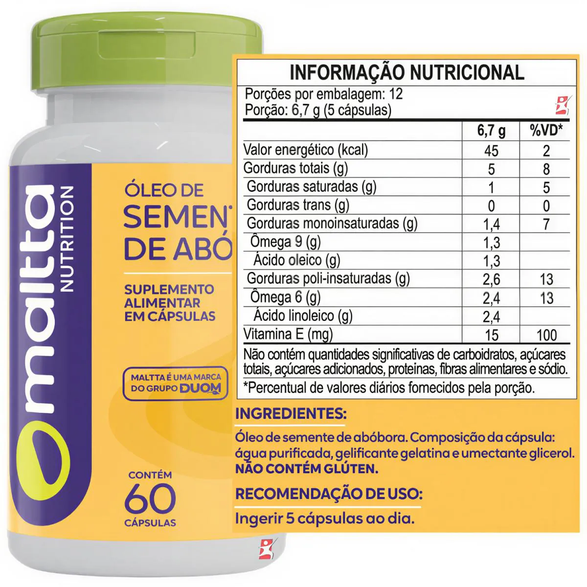 ÓLEO DE SEMENTE DE ABÓBORA FITOSTERÓIS 1G POR CÁPSULA 60 CÁPSULAS SAÚDE DO HOMEM - DUOM: MALTTA NUTRITION   DESCRIÇÃO O fitoesterol de beta-sitosterol é encontrado em concentrações significativas no óleo de sementes de abóbora e ajuda a bloquear os efeitos prejudiciais do hormônio (DHT), que promove a proliferação de células da próstata, resultando num aumento da glândula da próstata, o que pode levar a problemas como dor ao urinar e até câncer. Antiinflamatório para a bexiga e a uretra. Auxiliar no tratamento da artrite. Os altos níveis de antioxidantes, ácidos graxos e outros compostos no óleo de semente de abóbora são utilizados para ajudar a reduzir a inflamação nas articulações para quem sofre de artrite. Possui altos níveis de fitoesteróis, que ajudam a reduzir o colesterol LDL (o mau colesterol) diminuindo a sua absorção, quando ingerido antes das refeições. Auxilia no tratamento do síndrome do intestino irritável.   BENEFÍCIOS - Pode auxiliar a reduzir dores articulares; - Tem ação anti-inflamatória natural; - Pode auxiliar a reduzir dores musculares; - Protege o organismo contra radicais livres; - Combate a queda de cabelo; - Hidrata a pele.   SUGESTÃO DE USO Ingerir 5 cápsulas ao dia.   TABELA NUTRICIONAL Anexo nas imagens do anúncio.   COMPOSIÇÃO Óleo de semente de abóbora. Composição da cápsula: água purificada, gelificante gelatina e umectante glicerol. NÃO CONTÉM GLÚTEN.   RECOMENDAÇÕES & CUIDADOS  PRODUTO INDICADO A PESSOAS ACIMA DE 19 ANOS. ESTE PRODUTO NÃO É UM MEDICAMENTO. NÃO EXCEDER A RECOMENDAÇÃO DIÁRIA DE CONSUMO INDICADA NA EMBALAGEM. MANTENHA FORA DO ALCANCE DE CRIANÇAS. 1000mg de óleo de semente de abóbora prensado a frio por cápsula. CÁPSULA SOFTGEL.    DADOS TÉCNICOS Marca – Duom: MALTTA NUTRITION. Conteúdo líquido total – 120 cápsulas. Rendimento total – 24 porções/doses. Peso líquido total – 120g. Peso aproximado produto + embalagem - 250g. Código de barras (EAN) – 7898665750926. Registro ANVISA – Dispensado de registro de acordo com a resolução da RDC 27/2010 E RDC 240/2018 da ANVISA. Dimensões do produto – largura: 7 cm; altura: 13 cm; comprimento: 7 cm. Dimensões da embalagem/pacote - largura: 12 cm; altura: 10 cm; comprimento: 16 cm.   ITENS DO ANÚNCIO - 1 Unidade do produto: ÓLEO DE SEMENTE DE ABÓBORA FITOSTERÓIS 1G POR CÁPSULA 60 CÁPSULAS SAÚDE DO HOMEM - DUOM: MALTTA NUTRITION. Total – 60 Cápsulas POR FRASCO.