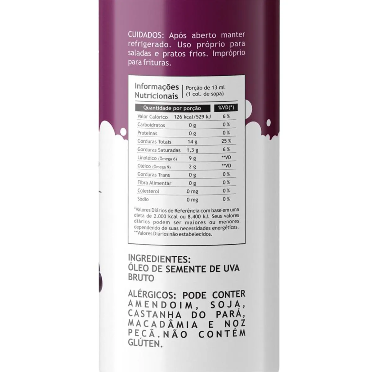 Óleo de Semente de Uva Extra Virgem Pazze 250ml Sobre o produto você sabia que a nossa conhecida uva, além de ser um delicioso e saboroso fruto, produz sementes cujas aplicações para a saúde são amplas e extremamente benéficas? conheça o óleo de semente de uva, um óleo vegetal prensado à frio, engarrafado e lacrado que pode ser utilizado nos mais variados pratos, dando um toque especial e delicioso às suas receitas favoritas! rico em ômega 6 e vitamina e, o óleo de semente de uva atua na diminuição do colesterol ruim (ldl), reduzindo os riscos de doenças cardiovasculares, ao mesmo tempo em que trabalha como um poderoso antioxidante natural, protegendo o corpo dos danos provocados pelos radicais livres e barrando o envelhecimento precoce da pele. o óleo de semente de uva é o parceiro que você procurava: unificando de forma harmônica propriedades benéficas para sua saúde, prevenindo doenças como trombose, hipertensão arterial e arteriosclerose, com qualidades positivas para a vitalidade da sua pele, promovendo tonificação, revitalização e rejuvenescimento da epiderme, deixando sua pele mais macia e suave ao toque. Modo de usar Utilizar como tempero de saldas ou na preparação de pratos especiais, ou também conforme orientação profissional. Ingredientes Óleo de Semente de Uva Bruto.