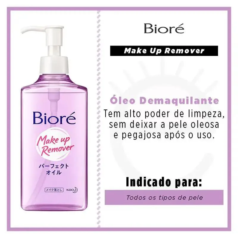 Óleo demaquilante para todos os tipos de pele. Bioré Make Up Remover remove as impurezas do rosto, sem deixar resíduos ou sensação oleosa. O Cleasing Oil Bioré Make Up Remover limpa inclusive as maquiagens mais resistentes e faz uma remoção eficiente dos resíduos até quando aplicado com as mãos e rosto molhados. Tudo isso graças à sua tecnologia de última geração, que é compatível com a água - ainda que a base do produto seja óleo. Ideal para quem ama skincare, mas deseja praticidade, o óleo demaquilante também pode ser usado durante o banho e dispensa o uso de algodão. Leve o seu e dê um up nos cuidados faciais! Modo de usar: Aplique o óleo demaquilante nas mãos e, em seguida, massageie delicadamente o rosto para remover a maquiagem, inclusive máscara à prova d`água. Para finalizar, enxágue abundantemente com água. Não é necessário uso de sabonete facial após a aplicação.