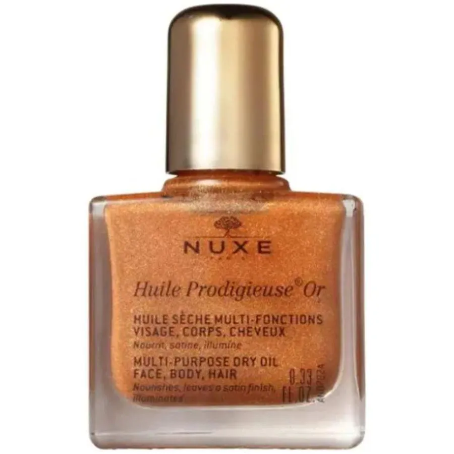 Mini Óleo iluminador multifuncional para corpo, rosto e cabelo. Nuxe Huile Prodigieuse OR tem fórmula nutritiva que suaviza, repara e dá brilho.