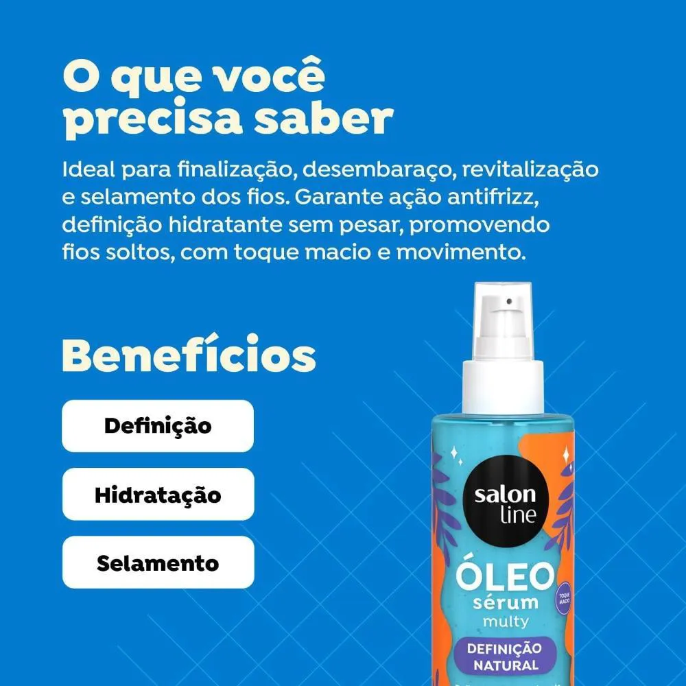 Óleo sérum multifuncional desenvolvido para garantir definição natural, hidratação leve e controle eficaz do frizz em cabelos ondulados, cacheados e crespos. Com textura leve e rápida absorção, proporciona brilho equilibrado sem pesar, mantendo o movimento e a forma dos cachos.Sua fórmula vegana e liberada combina água de coco, colágeno vegetal e extrato de hibisco, ativos que atuam na reposição hídrica, na elasticidade da fibra capilar e na vitalidade dos fios. A água de coco ajuda a combater o ressecamento diário, o colágeno vegetal contribui para fios mais resistentes e definidos, enquanto o hibisco melhora a maleabilidade e o alinhamento dos cachos.Versátil para a rotina capilar, pode ser usado nos cabelos úmidos para facilitar a finalização e potencializar a definição ou nos fios secos para controlar o frizz, revitalizar os cachos e selar as pontas no day after. O acabamento é leve, com toque macio e sem resíduos oleosos.Indicado para curvaturas 2ABC, 3ABC e 4ABC, é ideal para quem busca definição suave, brilho natural e controle duradouro.