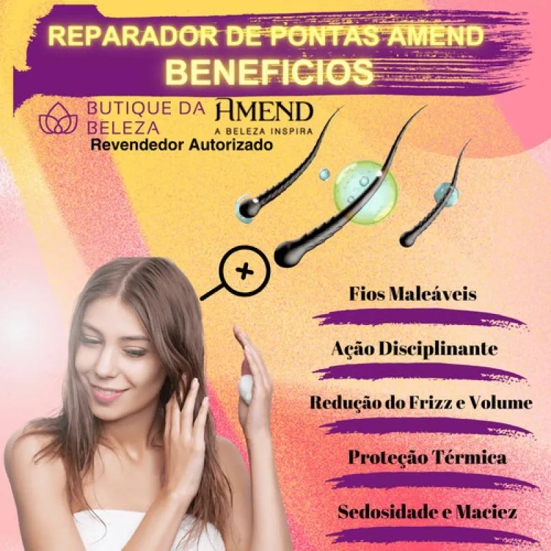 Somos a BUTIQUE DA beleza Uma empresa especializada no comércio de Cosméticos e Semijoias. Estamos sempre entre os Melhores Vendedores. NOSSO COMPROMISSO É COM VOCÊ! SEU CONFORTO E SEGURANÇA SÃO NOSSOS PROPÓSITOS SERVIR E AJUDAR SÃO NOSSOS DEVERES REPARADOR DE PONTAS AMEND TRADICIONAL 60ml Se o seu cabelo está constantemente com frizz e você sofre pela retenção excessiva de umidade nos fios, nós apresentamos seu melhor aliado… O Reparador de Pontas Amend Tradicional é o finalizador e redutor de pontas duplas mais amado por mulheres e profissionais do ramo. Através da combinação de silicones de ótima qualidade, promove a redução de pontas secas, duplas e espigadas. De cheiro maravilhoso, fragrância adocicada, floral, e suavemente frutada, acompanha uma embalagem linda, que o faz da aplicação uma experiência de uso. O Finalizador Amend Tradicional possui textura densa, porém aspecto não gorduroso, e secagem muito rápida. Por isso é ideal para aplicação antes da escova e secador, já que também possui a proteção térmica e contra raios UV, indispensável aos fios. Esse excelente redutor de pontas duplas fará com que seu cabelo fique mais maleável, sem frizz, com sedosidade e maciez, sem contar na ação disciplinante dos fios. Por isso não perca tempo e tenha em mãos esse excelente Reparador, seus cabelos agradecerão ATIVOS Silicones INDICADOS Todos os Tipos de Cabelos Cabelos Cacheados Cabelos Crespos BENEFÍCIOS Proteção Térmica Hidratação Brilho Maciez Redução de Volume Redução de Frizz Sedosidade MODO DE USO Coloque de 2-3 gotas do Reparador de Pontas Amend na palma da mão e aplique nos cabelos secos ou úmidos. Finalize como desejar. DICA DA BUTIQUE DA BELEZA Pode ser usado para selagem de pontas.