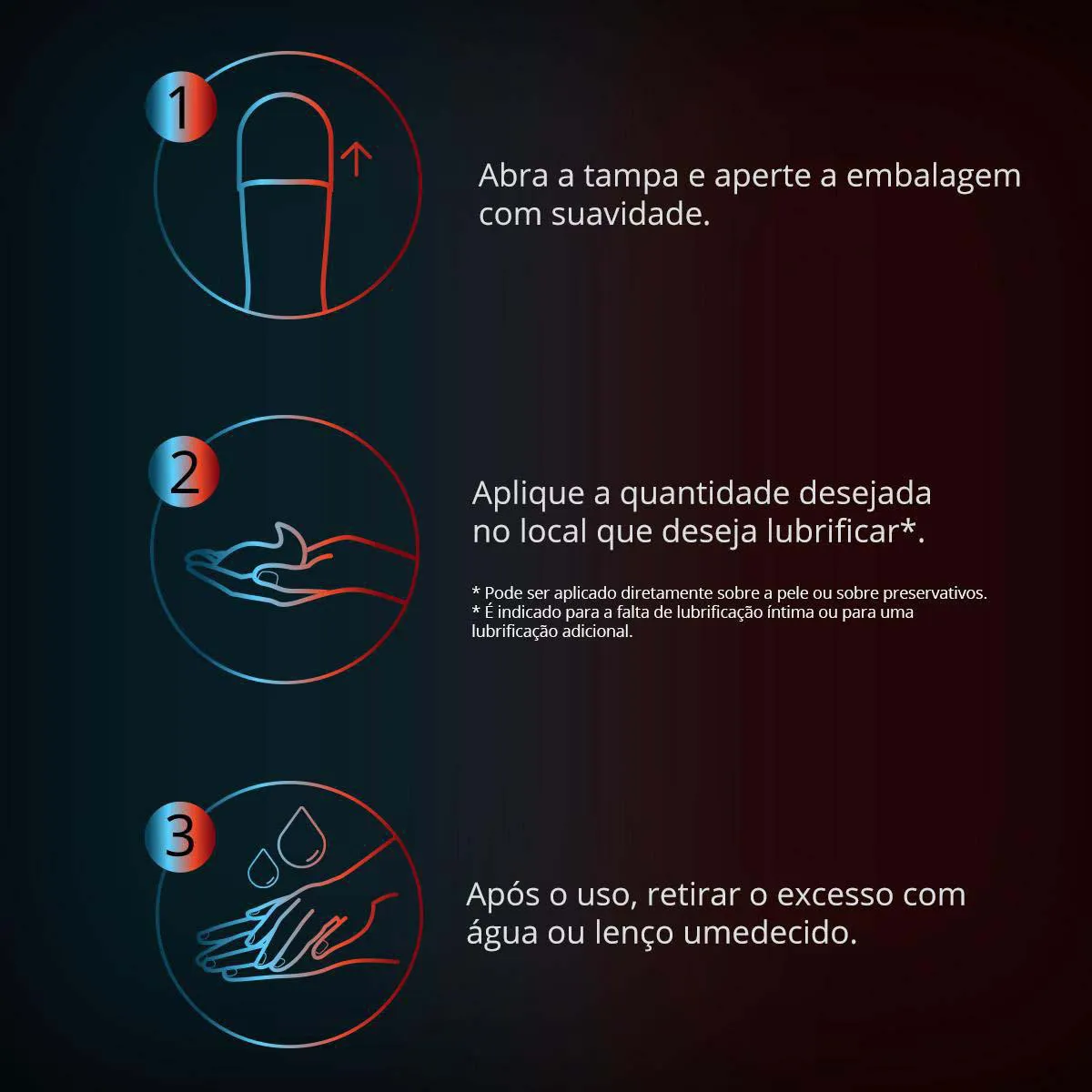 Aplique a quantidade desejada sobre a área a ser lubrificada, podendo ser diretamente na pele ou sobre o preservativo.