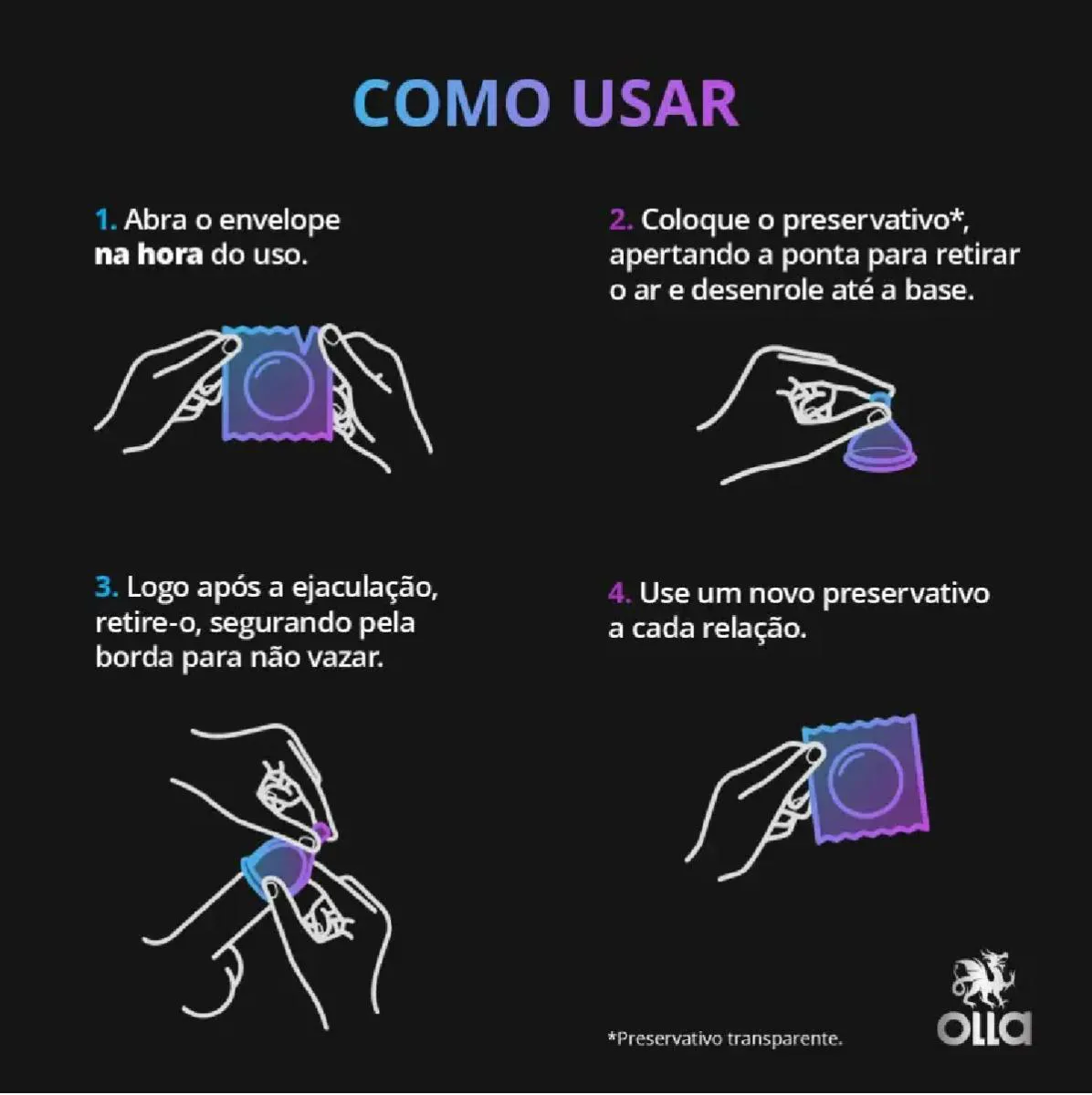 Leia as instruções de uso impressas no interior dessa embalagem, principalmente no caso de sexo não vaginal. Nenhum método contraceptivo proporciona 100% de proteção contra a gravidez, HIV ou outras doenças sexualmente transmissíveis. Abrir somente na hora do uso. O preservativo deve ser colocado assim que ocorrer a ereção, antes de qualquer contato genital ou penetração.