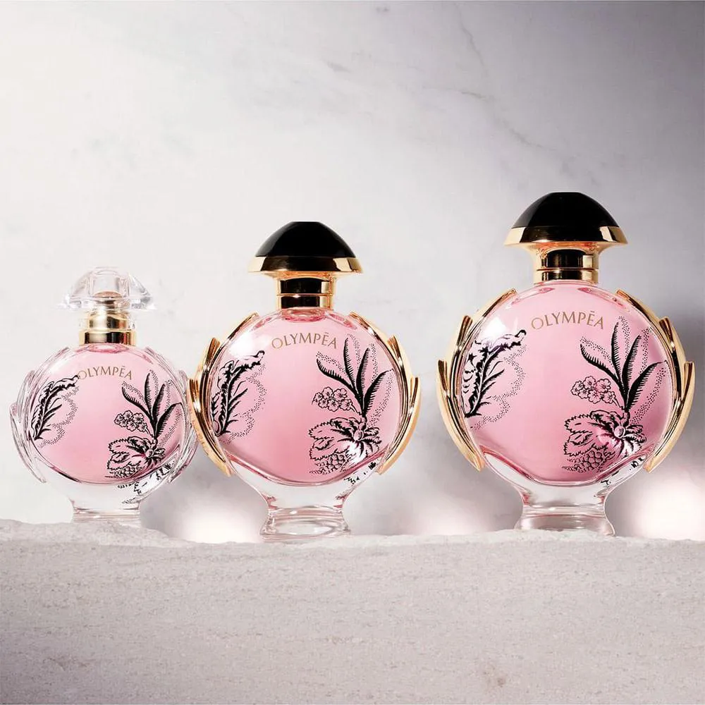 O icônico frasco de Olympéa recebe o grafismo de um buquê de flores pretas inspirado no estilismo Rabanne e um contraste marcante na tampa.